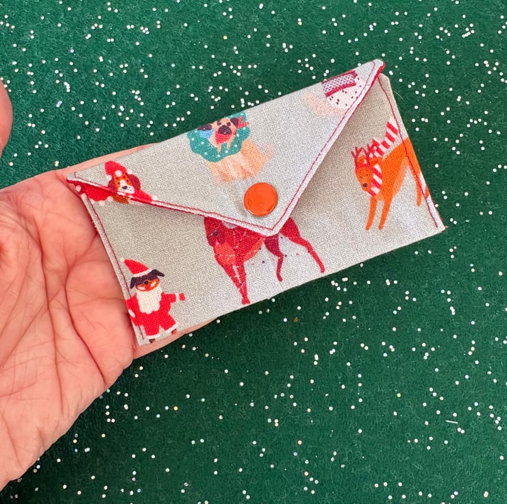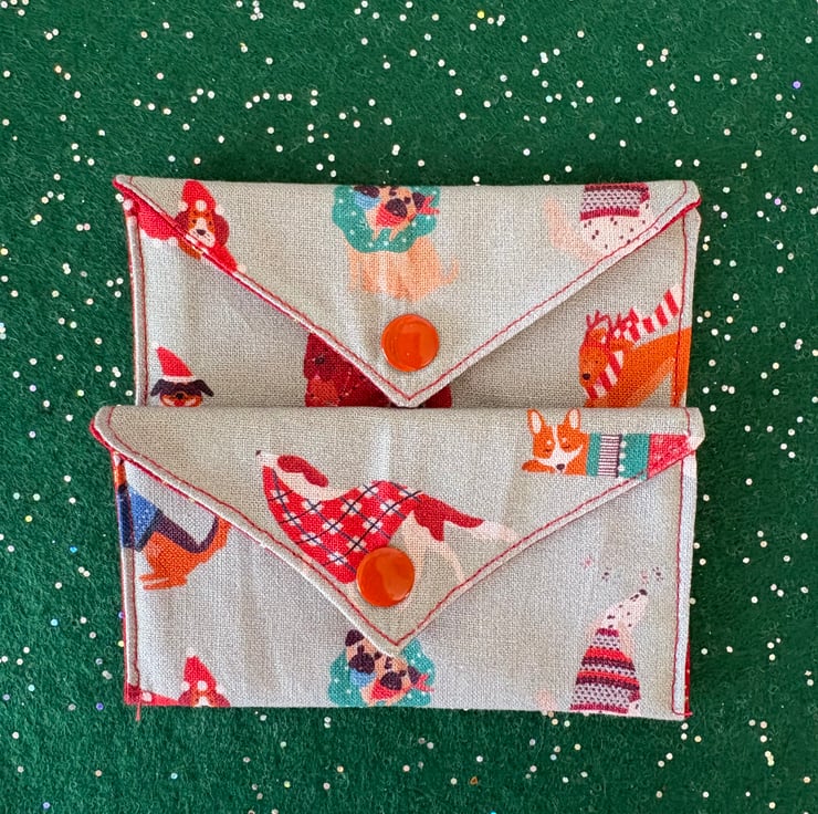 Featuring a cute dog in Christmas jumpers design on a. grey background, each purse is made from a 100% cotton and is fully lined in a complimentary red and gold star fabric. Both purses feature an orange snap button.