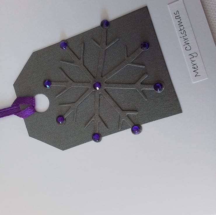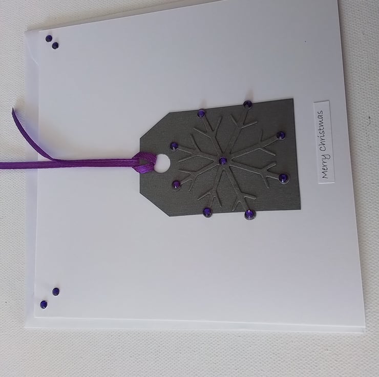 Handmade Christmas card with a grey snowflake topped with purple beads.