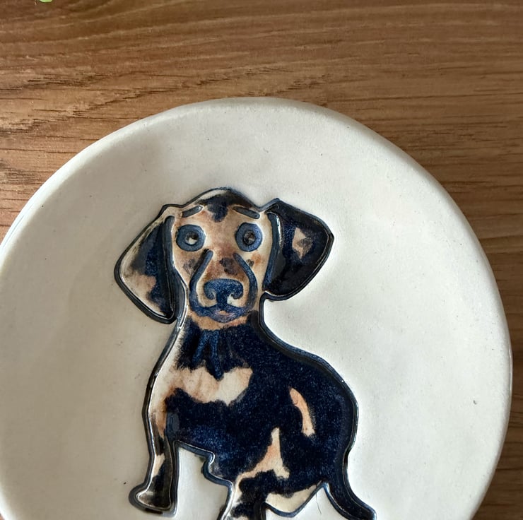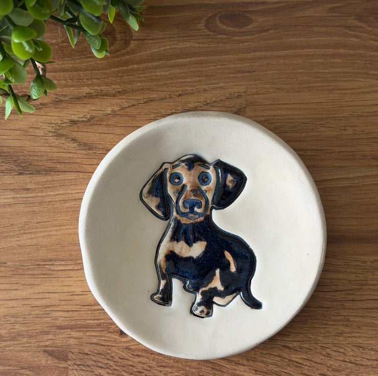 Little Dog, Big Style This small ceramic dachshund dish is perfect as a decorative piece or for holding jewellery, loose change, or other small items. Please note a slight imperfection: the glaze is a little cloudy in places, as shown in the photo, but this does not affect the item’s functionality or overall charm.