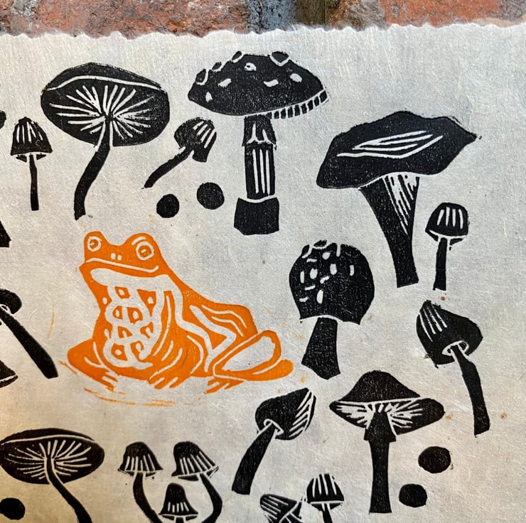 Printed on beautifully textured lokta paper, and approximately post card size and has deckled edges. This charming lino print has been hand-burnished with oil-based ink so every print is unique and the colour is everlasting.