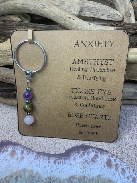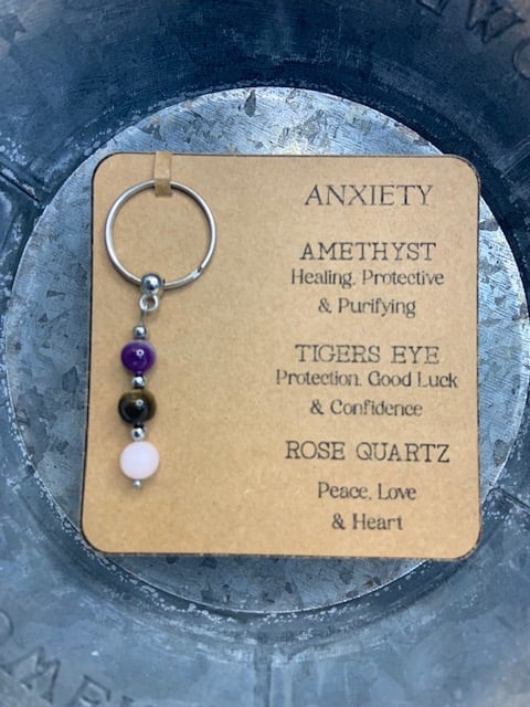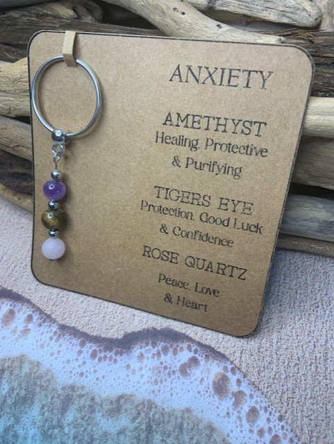A lovely gemstone keyring to help with Anxiety the keyring has Amethyst the symbol of Healing, Protective and Purify. Tigers Eye the symbol of Protection, Good luck and Confidence. Rose Quartz the symbol of Peace, Love and Heart