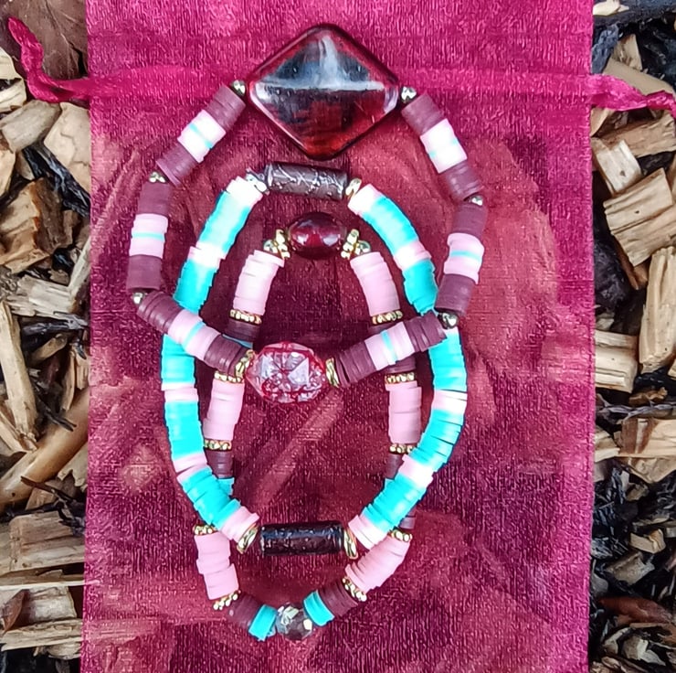 Each individual bracelet is hand crafted using a unique mix of clay polymer beads, charms and beads threaded onto strong, stretchy, clear jewellery thread. The set of three is carefully coordinated using a shared colour palette making a very pretty adornment. You can wear them together or individually as you choose