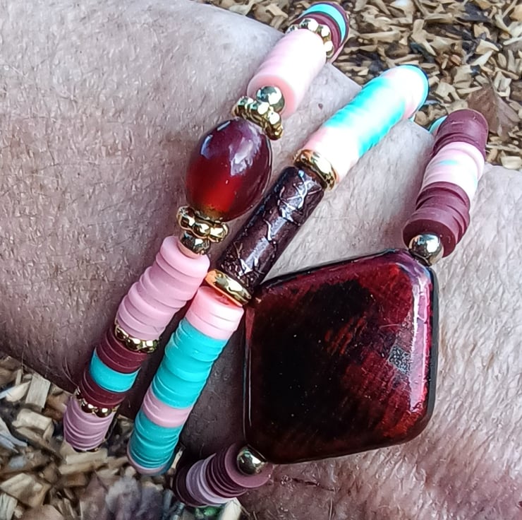 1. Aladdin's Cave - red diamond shaped bead, hexagonal red/white bead and burgundy, pink and turquoise clay polymer beads.