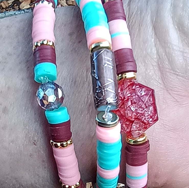 3. Genie - red oval bead, sparkly pink bead with pink, burgundy and turquoise clay polymer beads