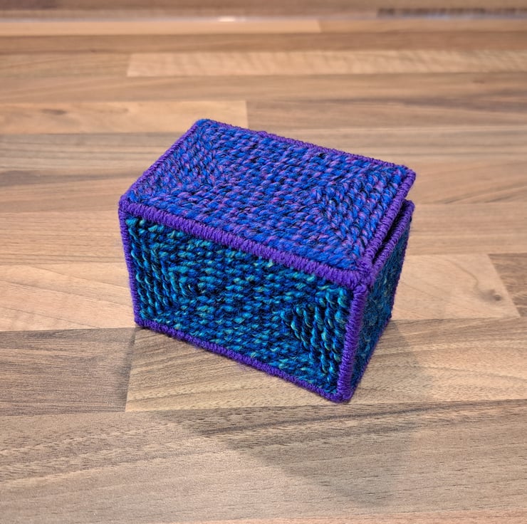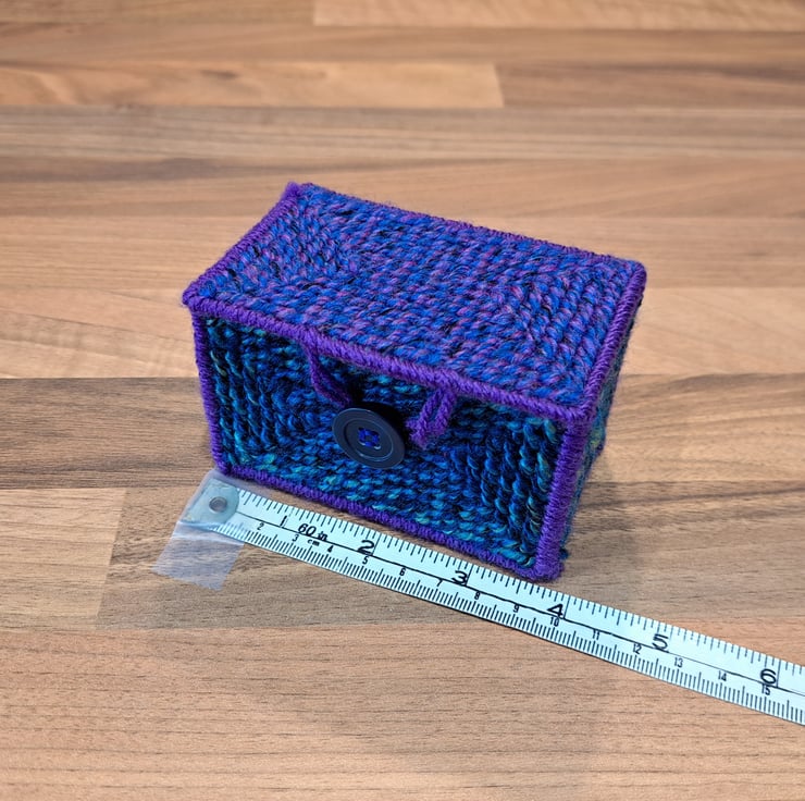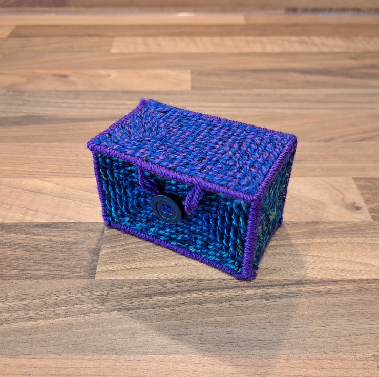 Keep all your business cards together in this purple, blue, and green card holder with navy button and string closure on the front. Can also be used for other small desk items.