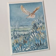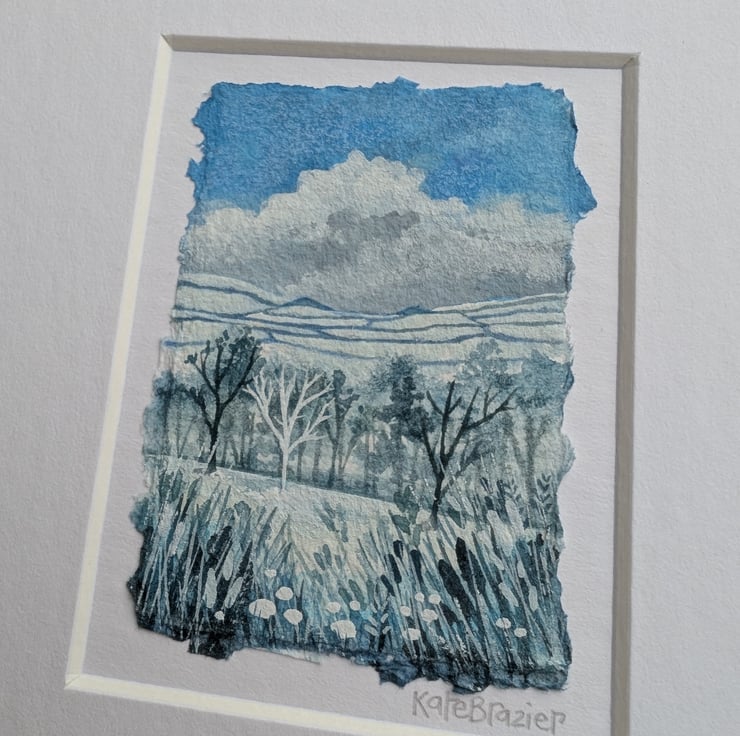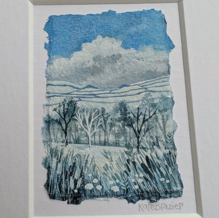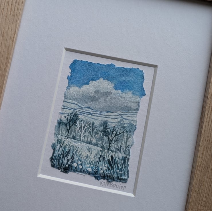 'Snowy Hills' is a tiny, mixed media miniature float mounted into a custom A5 mount and framed in custom oak, glazed frame.