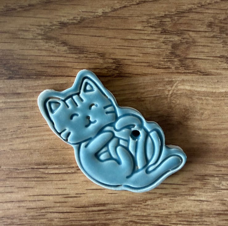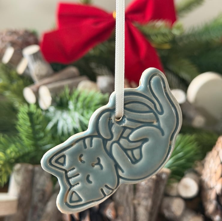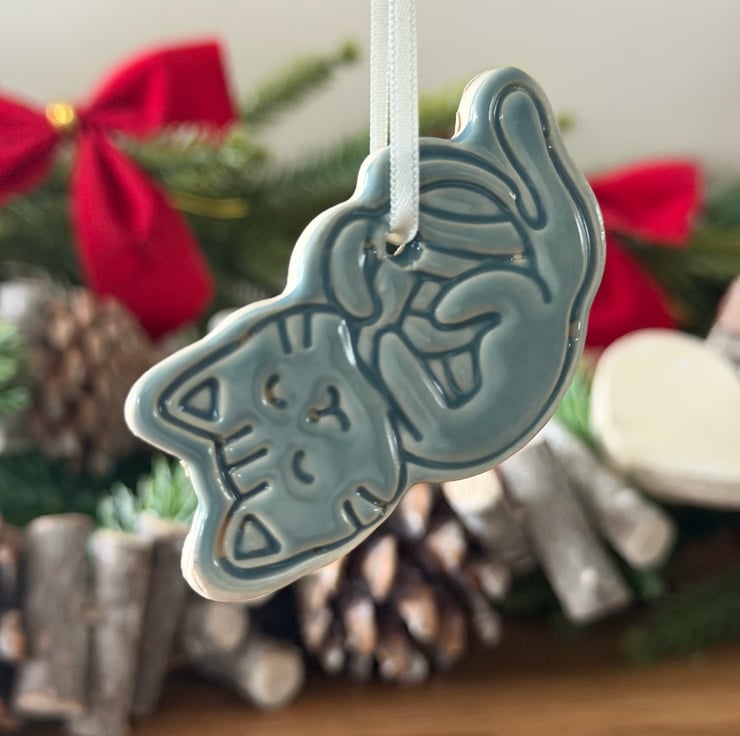 Adorable ceramic cat ornament, perfect for cat lovers! Handcrafted and finished in a soft blue-grey glaze. Comes with a cream ribbon, or you can add your own for a personal touch. Ideal for hanging on your Christmas tree or giving as a thoughtful gift.