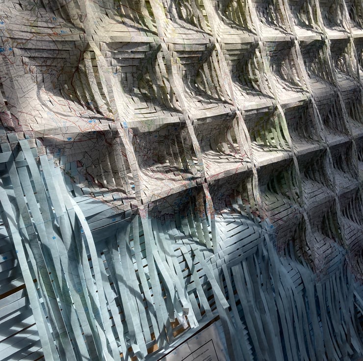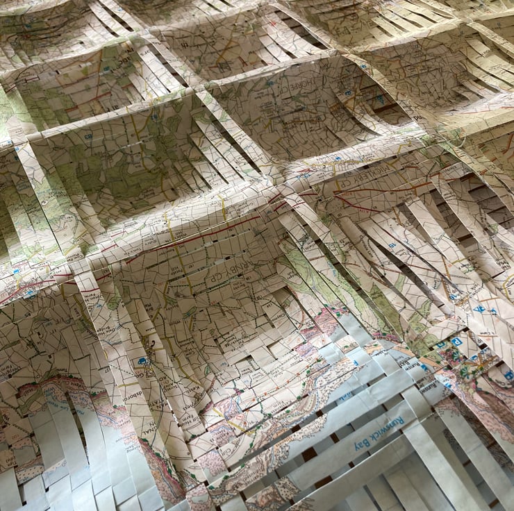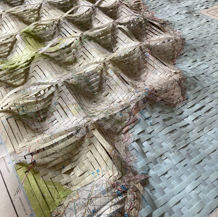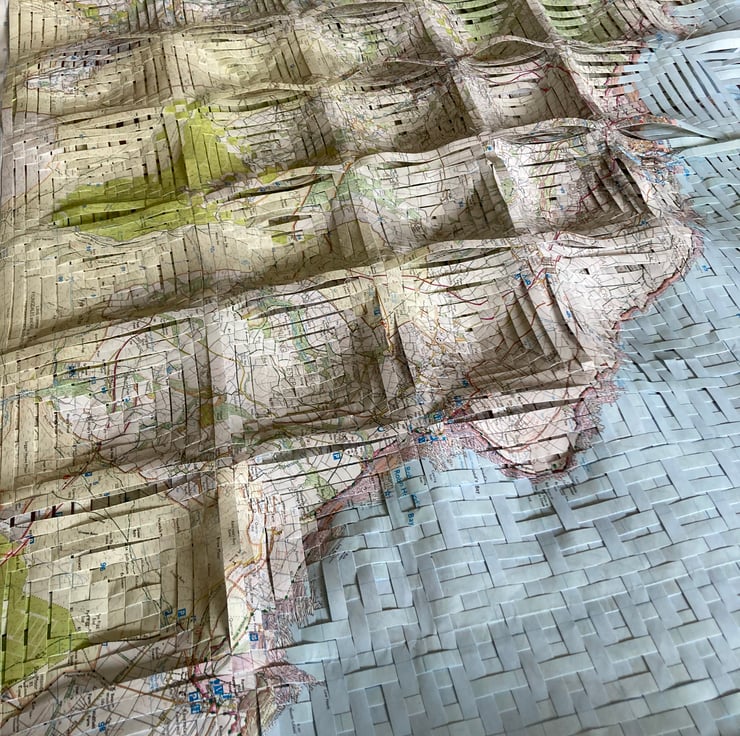 A love letter to the ever-changing coastline of North Yorkshire. A statement framed woven map of the coast created from two ordnance survey maps woven together to create a three-dimensional recreation. The land is woven in a waffle weave creating dramatic troughs of geological features such as the Hole of Horcum. I collapse this structure into a crackle wave draft to represent the sea, which as a soft wave effect.