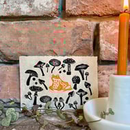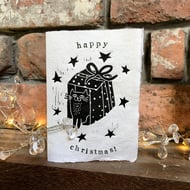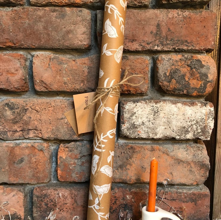 Made using handmade lino stamps hand printed on recyclable kraft paper. Also comes with a recyclable gift tag and reusable twine.