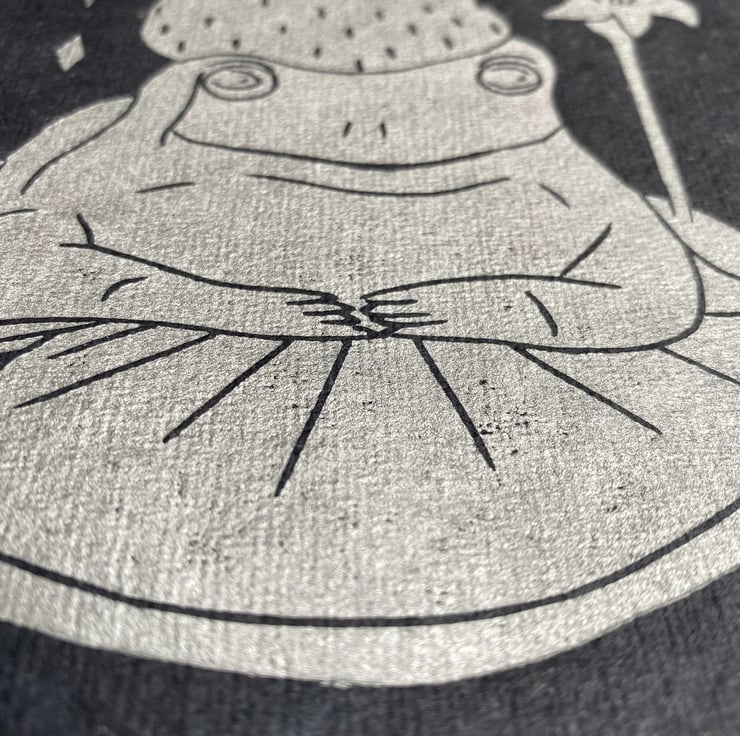 Magical silver strawberry frog lino print on black khadi paper. Hand cut and hand printed!
