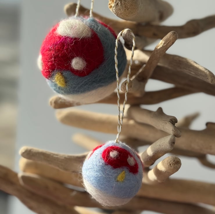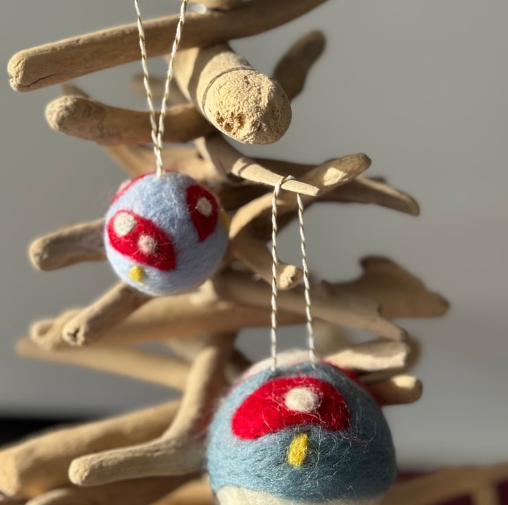 A pair of hand felted Christmas baubles featuring rich red toadstools.