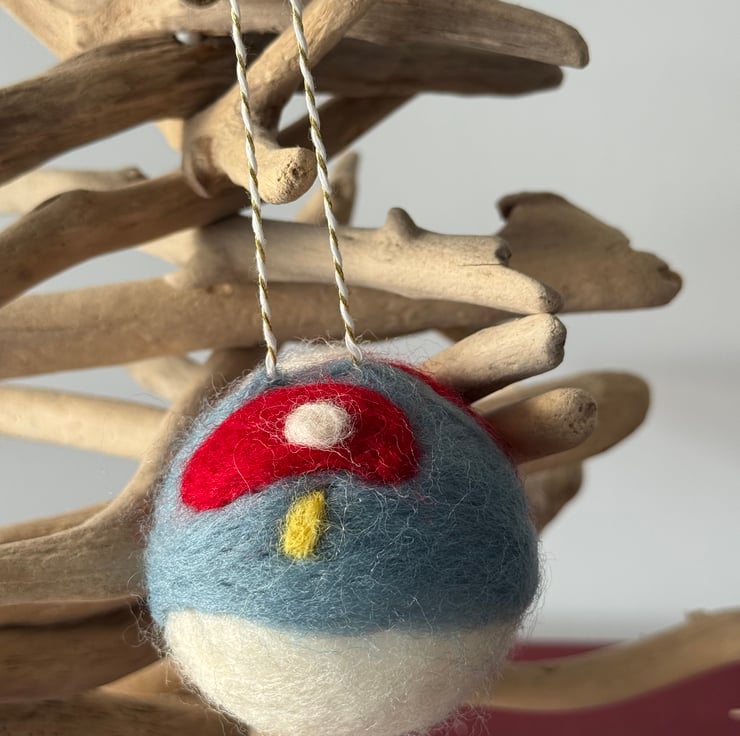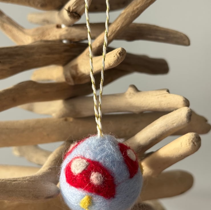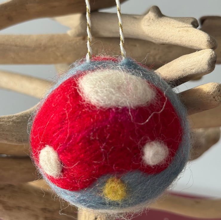 The bigger bauble measures 6cm with a loop of 5cm and has a large toadstool wit a smaller on on the other side.