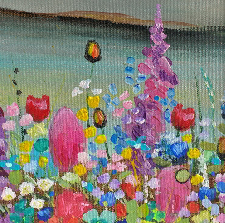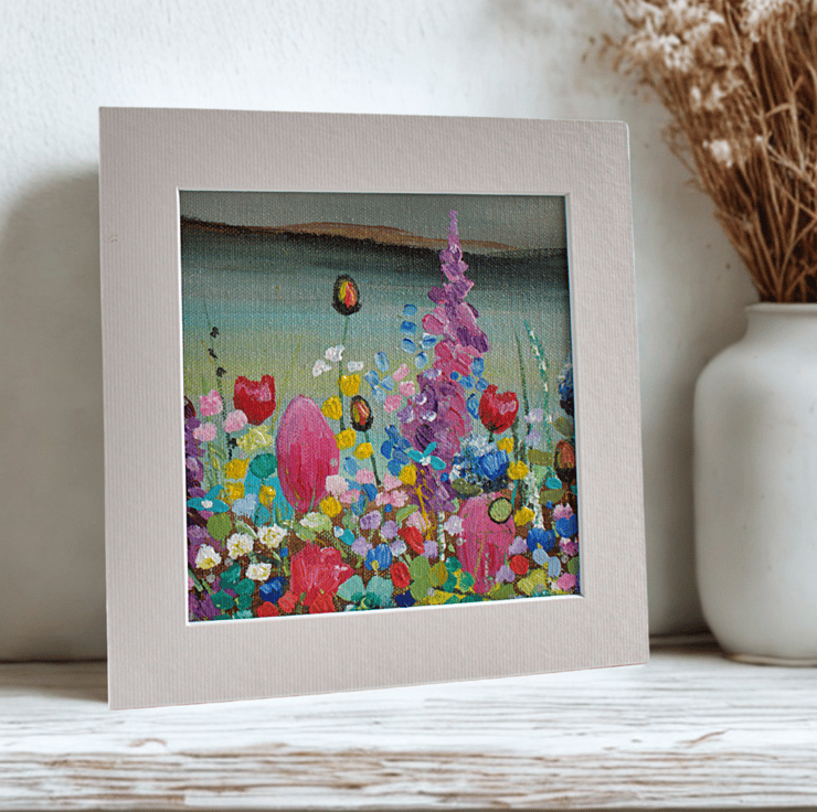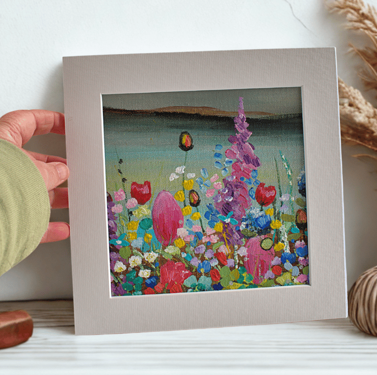 This is a small mounted painting of based on my trips to Loch Lomond over the years. In the foreground is a riot of colourful wildflowers surrounding the loch and the hills beyond. I have applied the acrylic paint using a variety of soft brushes and palette knives.