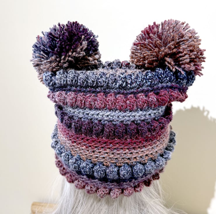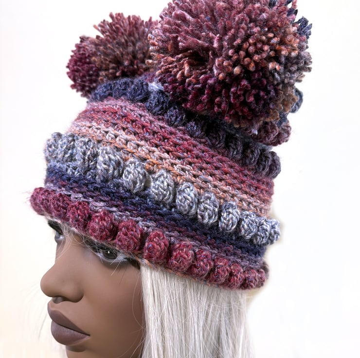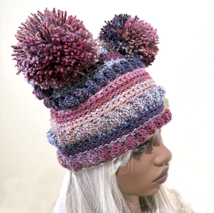 Quirky pom pom hat made from super soft and washable acrylic yarn in sott heather pinks and greys. and blues. Unique and warm. Makes an ideal affordable stocking filler or secret santa gift.