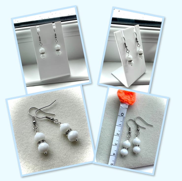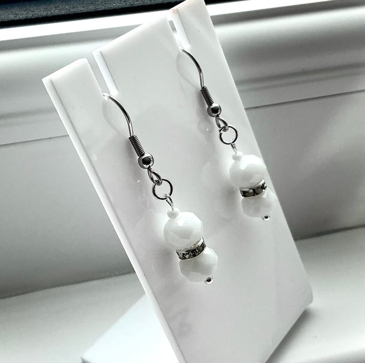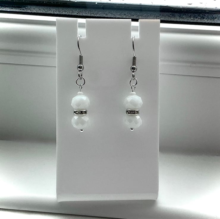 White faceted beads for these small drop earrings. Twin beads with a diamante spacer for that touch of sparkle.