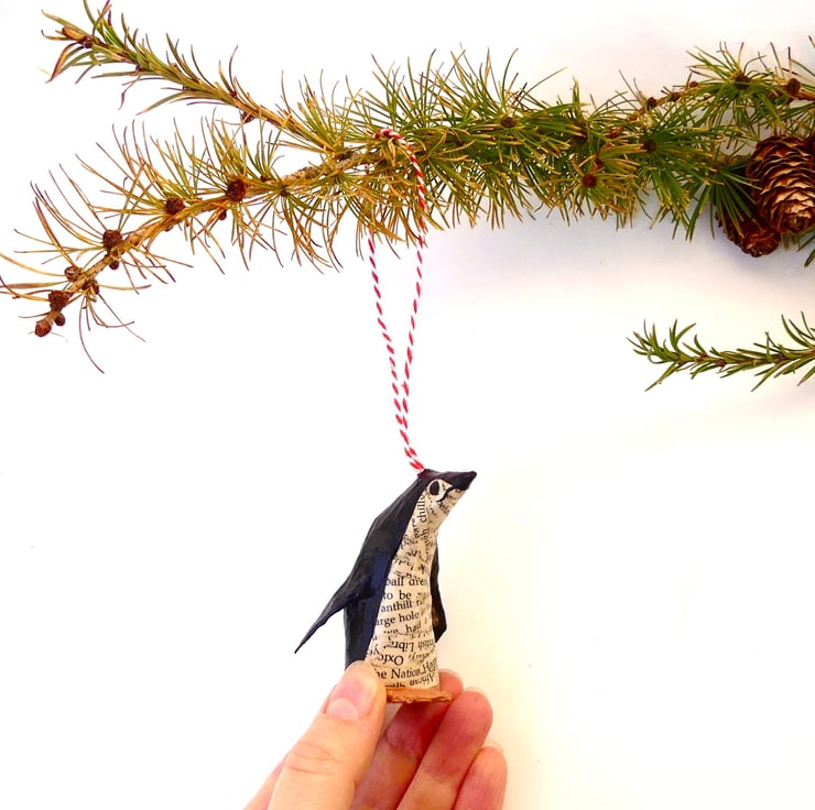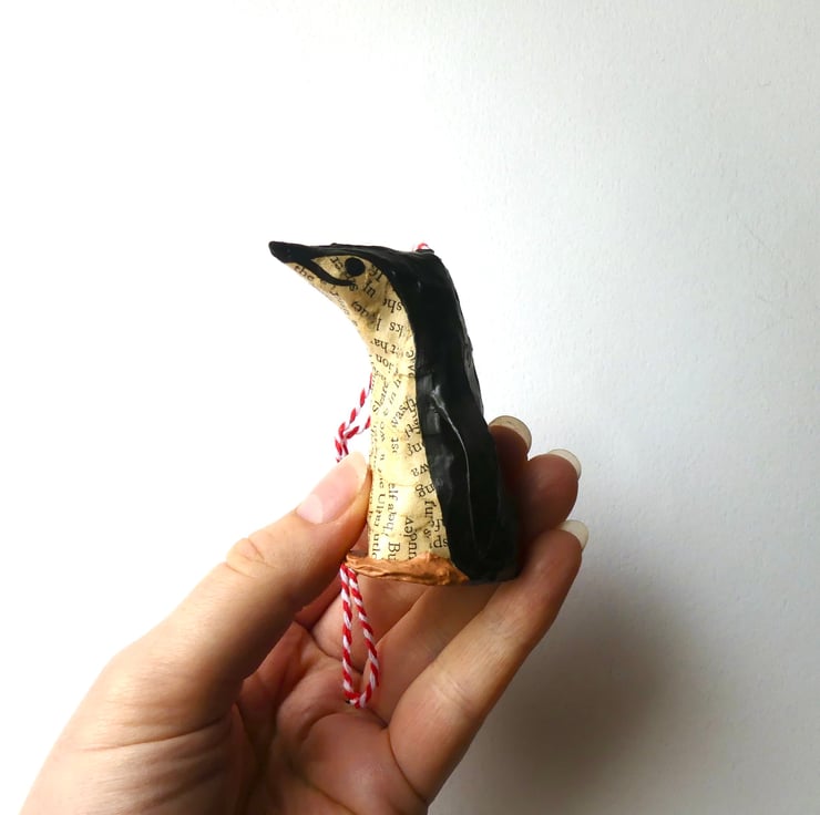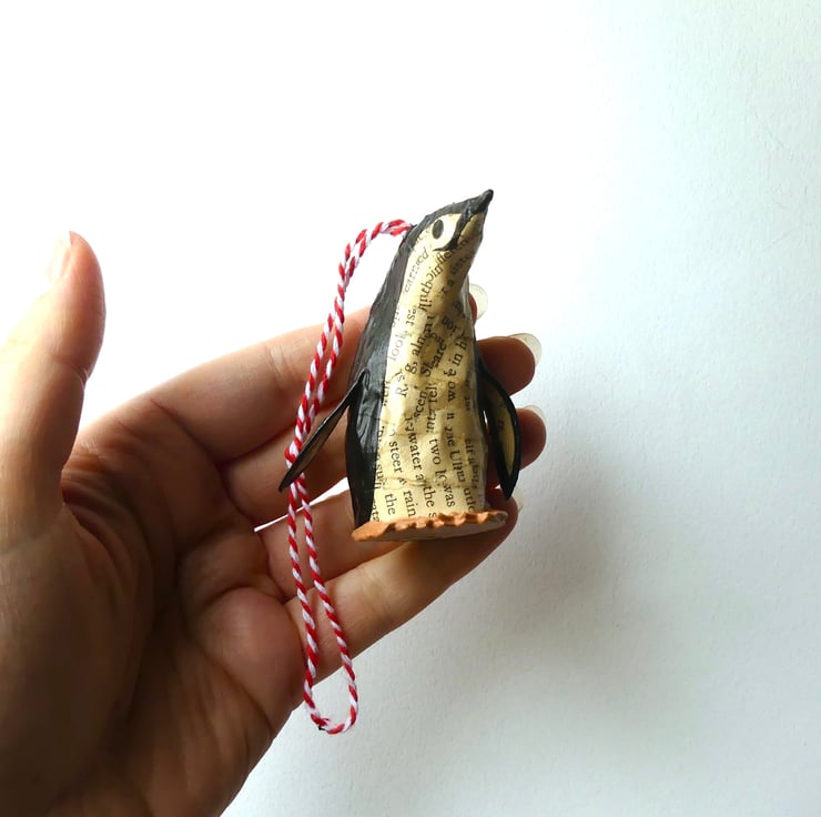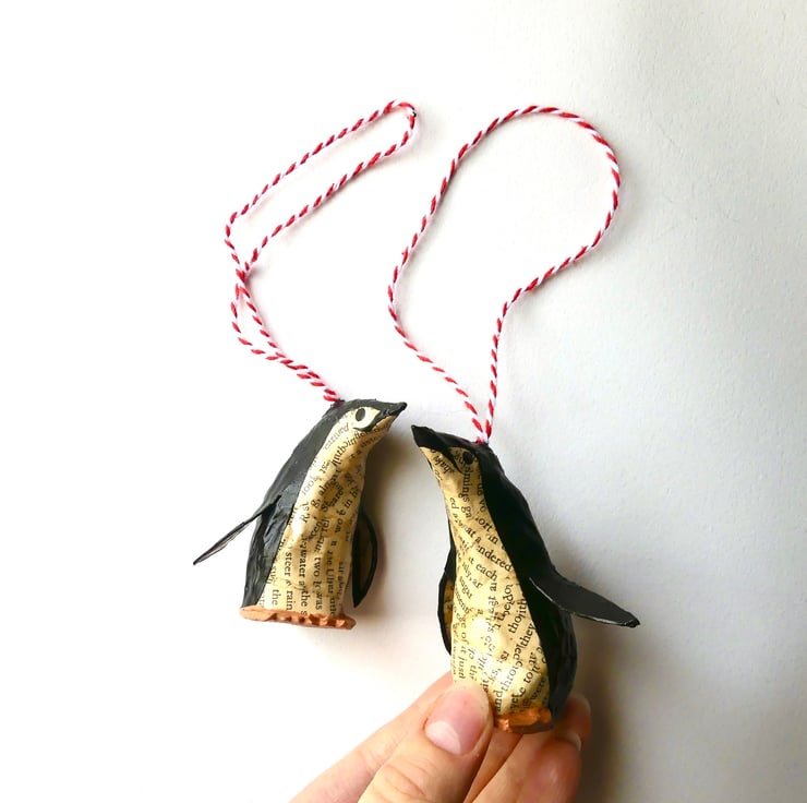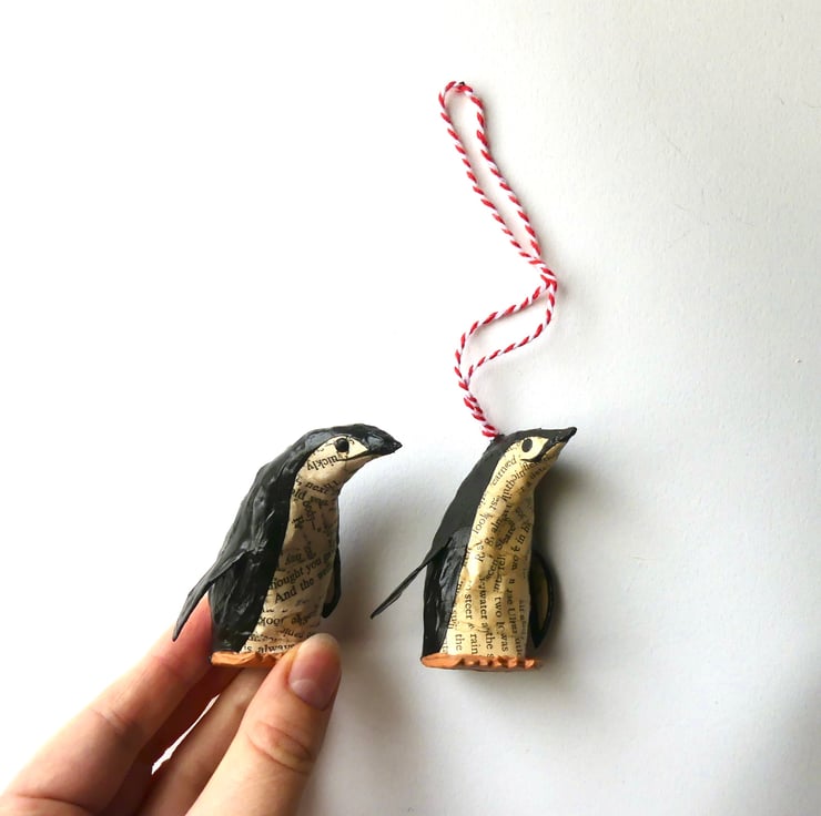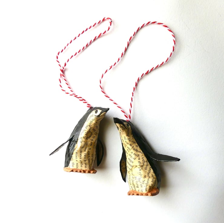 Set of 2 miniature custom penguin bird model decorations hand made from recycled vintage books. Coat colours created from recycled book pages and acrylic paint.