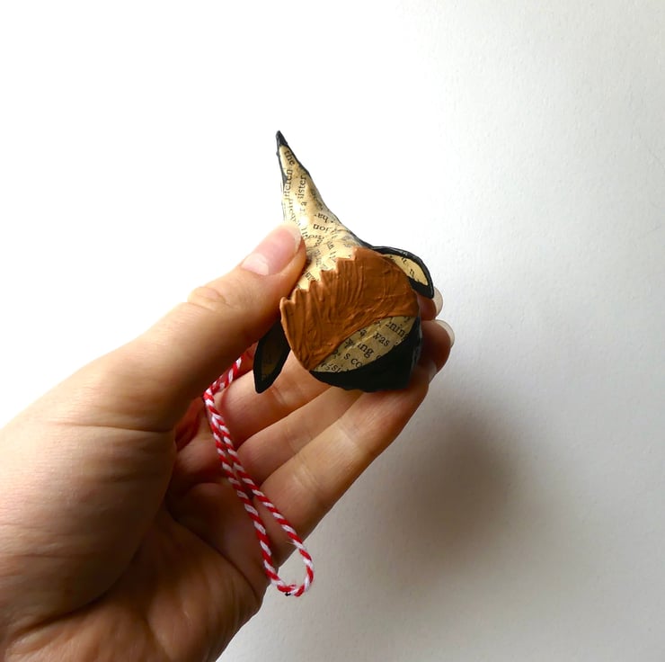 My little animal models are inspired by the stories I tell myself when I walk in the forest near my home and my childhood toys. I created these unusual, quirky sculptures because I wanted to decorate my bedroom with little woodland creatures, crooked wooden houses and miniature Canadian log cabins. I build these from recycled vintage book pages - I do not use any wire structure underneath, each sculpture is built entirely from the paper. I paint each animal carefully by hand. Each sculpture is unique in shape, appearance and character.