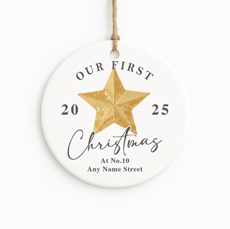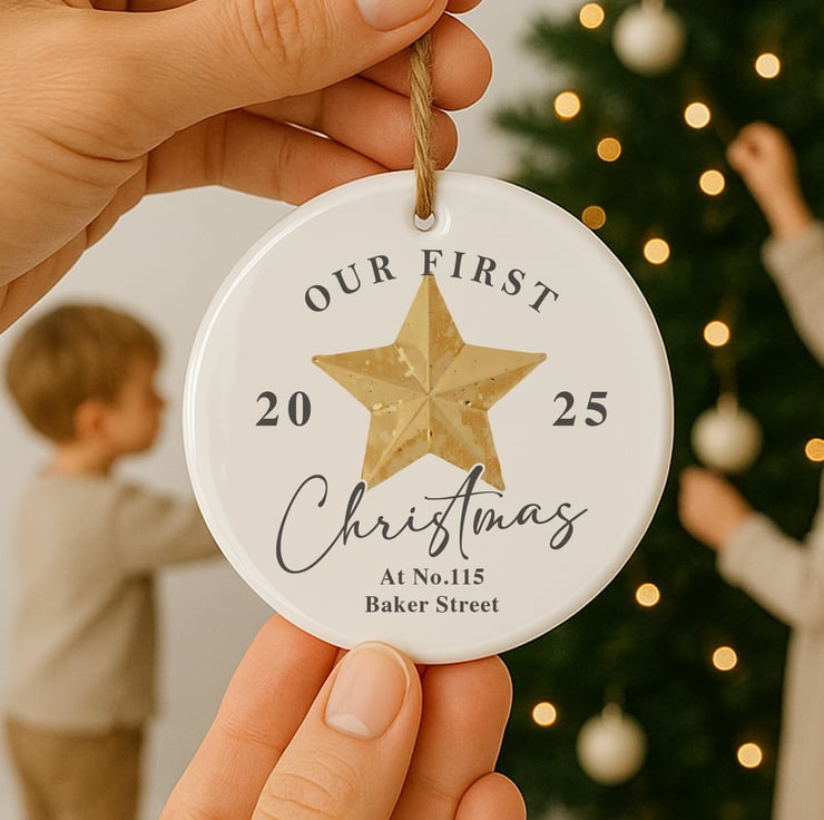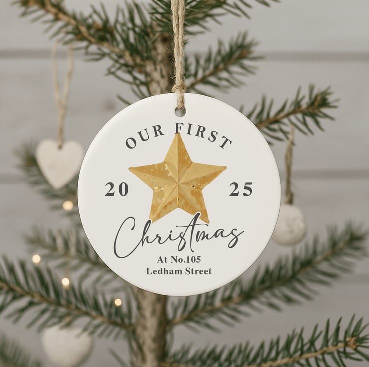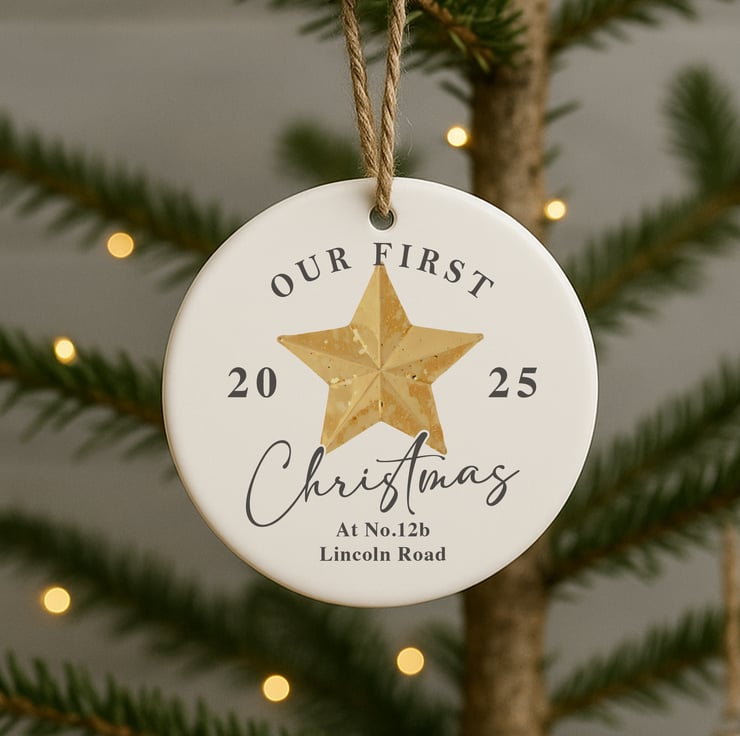 Custom First Christmas Decoration – Personalise with your home details and year for a keepsake celebrating your first festive season in a new house.