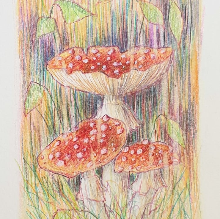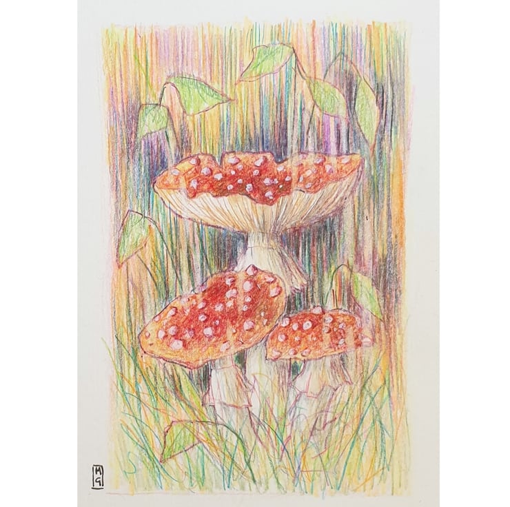 A very small drawing of fly agaric mushrooms in colour pencil. The drawing is in a very loose, soft focus, painterly style.
