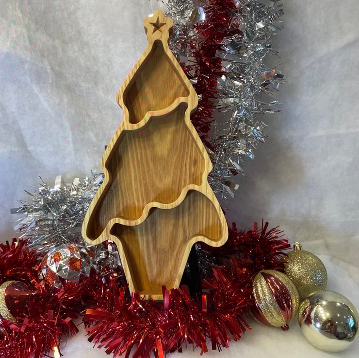 Crafted from beautiful ash hardwood, this Christmas tree shaped tray brings a warm, homemade touch to your holiday season. Each piece is CNC carved for precision, then hand finished and treated with food safe cutting board oil to highlight the natural grain and earthy character of the wood.