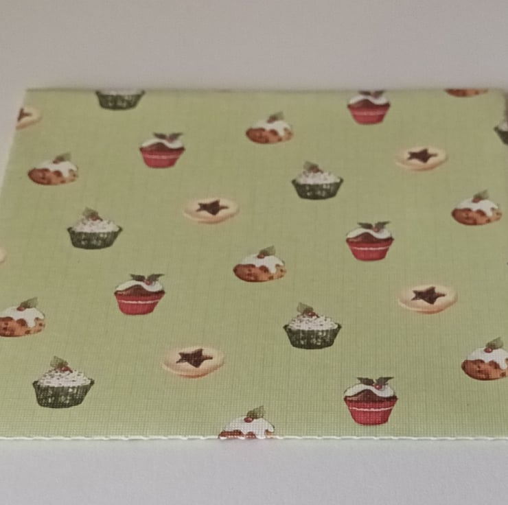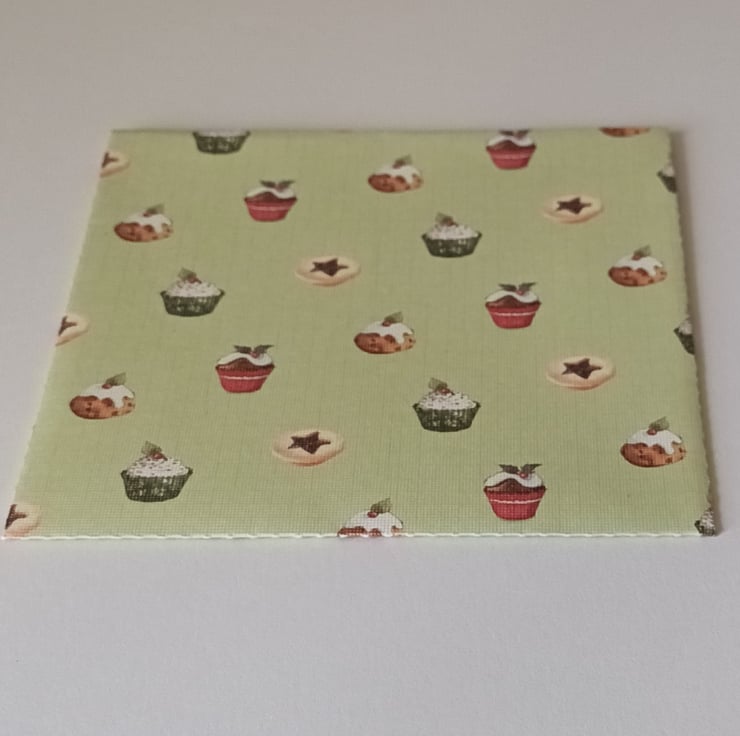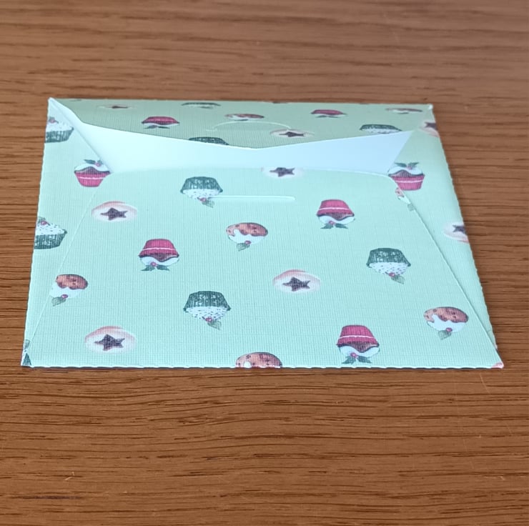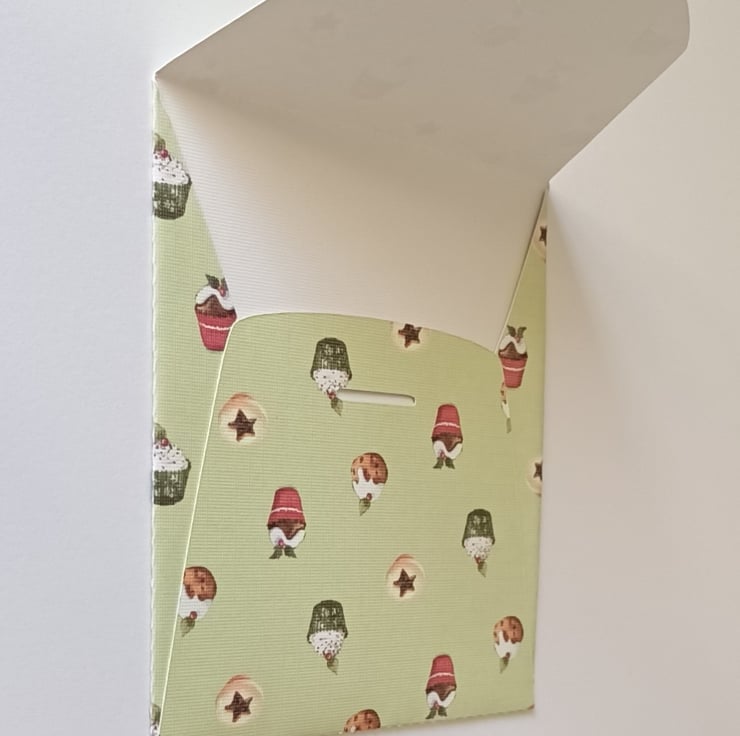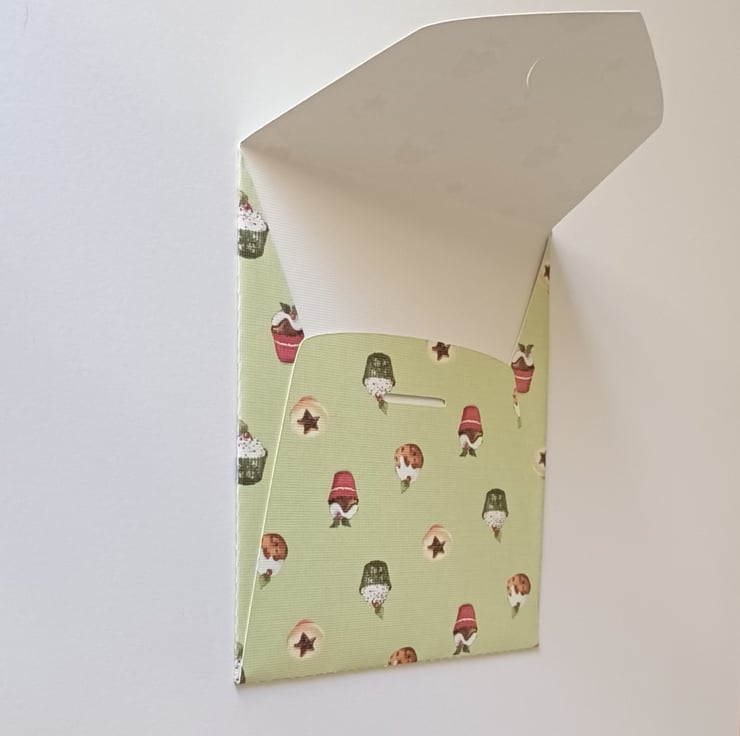 Gift card envelope featuring tasty mince pies and Christmas pudding cupcakes on an apple green background.