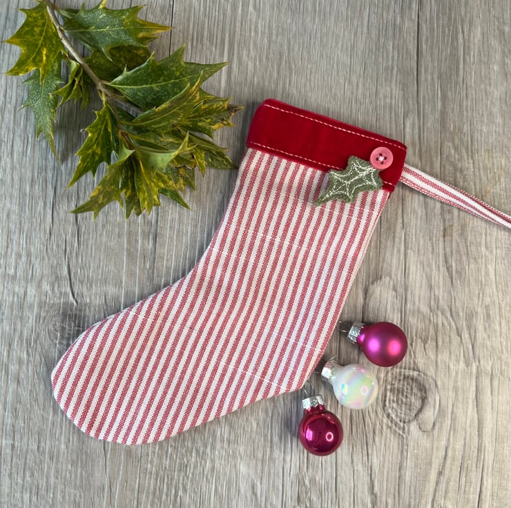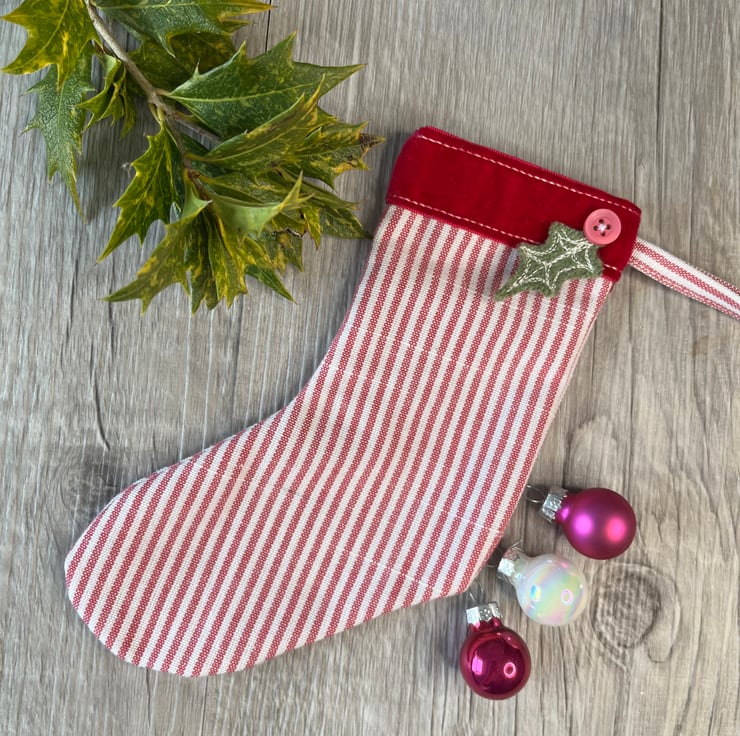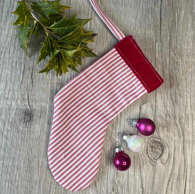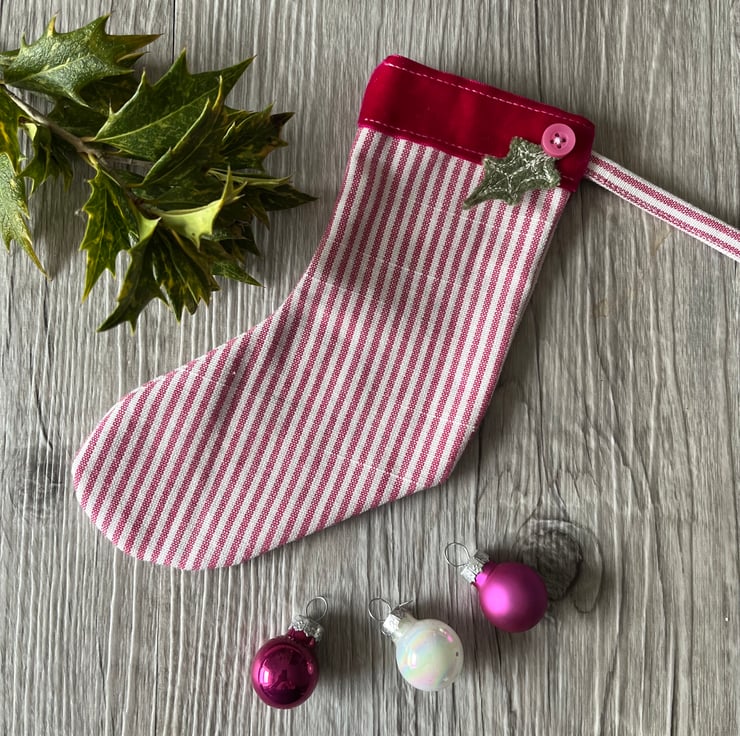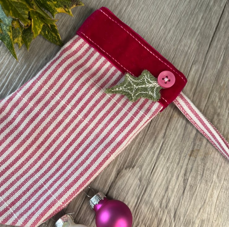 This charming Christmas stocking combines crisp pink and white cotton, with a rich pink velour trim and a hand dyed green felt embroidered holly leaf. It could be filled with little gifts or simply used as a decoration either in a traditional or contemporary setting. Its pinks are are a welcome change from red and green and it would make a lovely seasonal gift for a friend.