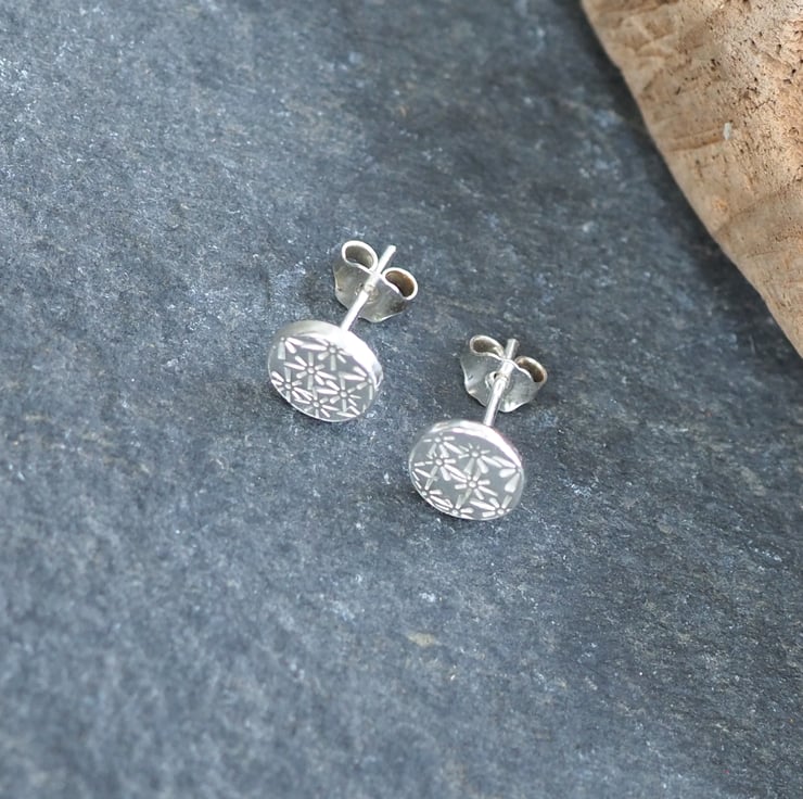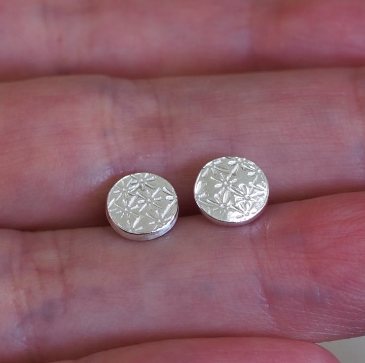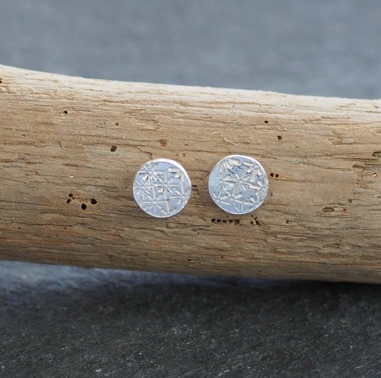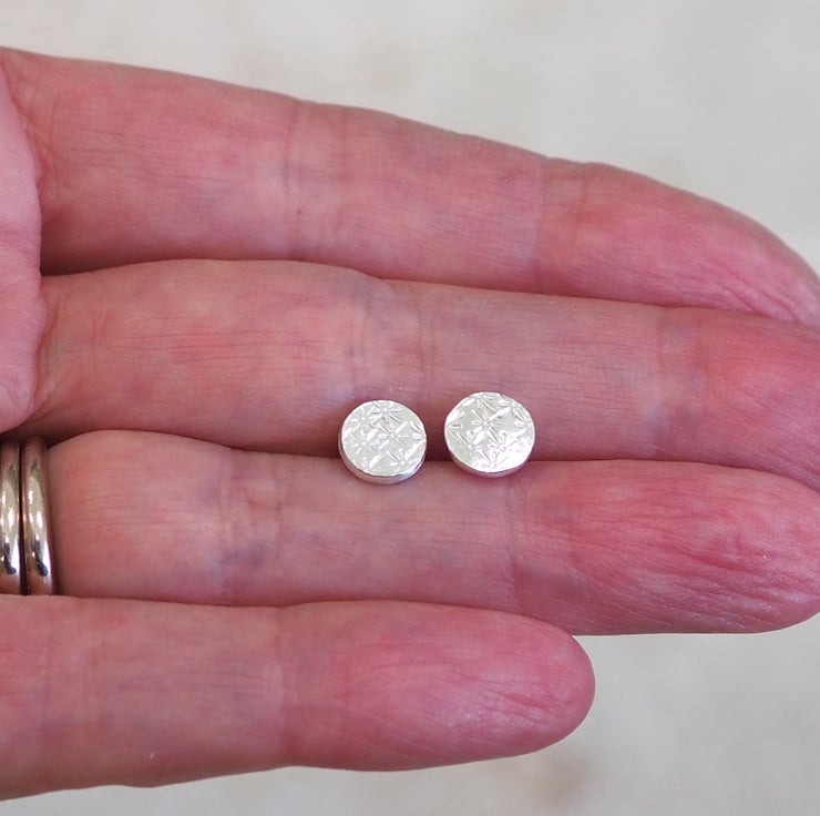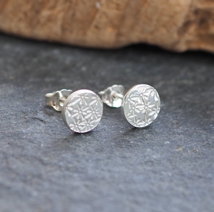 Silver disc stud earrings with floral starburst pattern punched into the silver. Minimalist earrings, ideal for everyday wear.