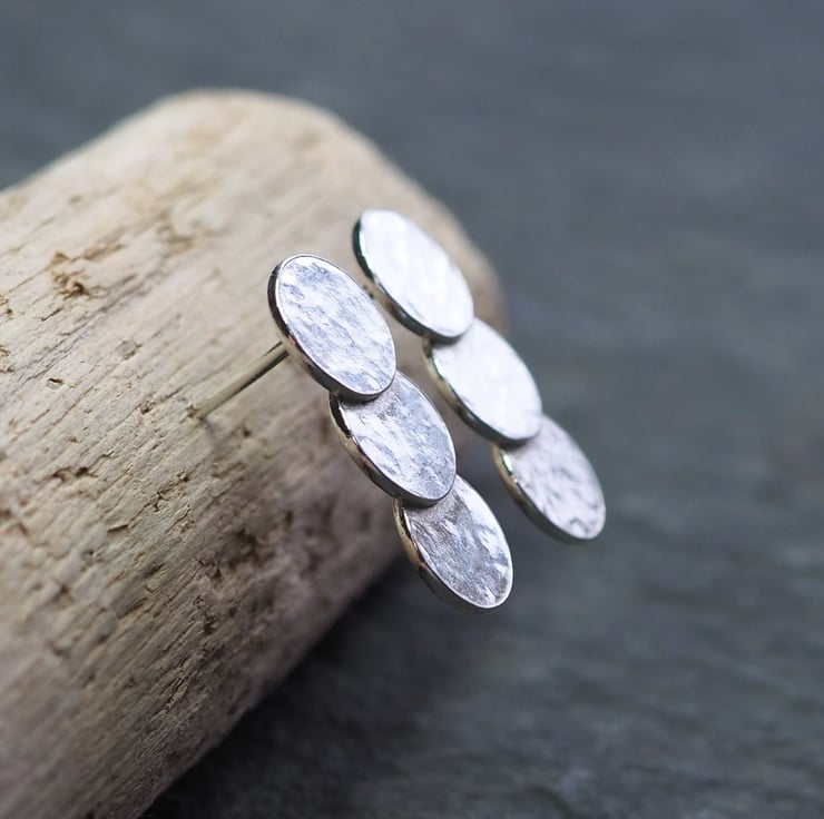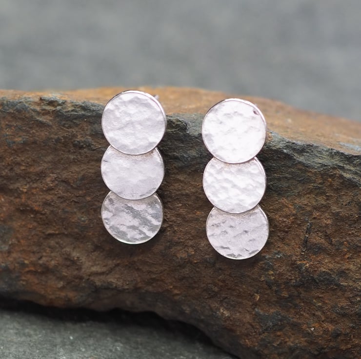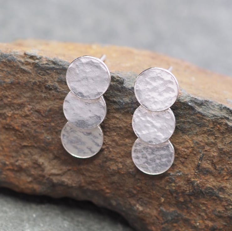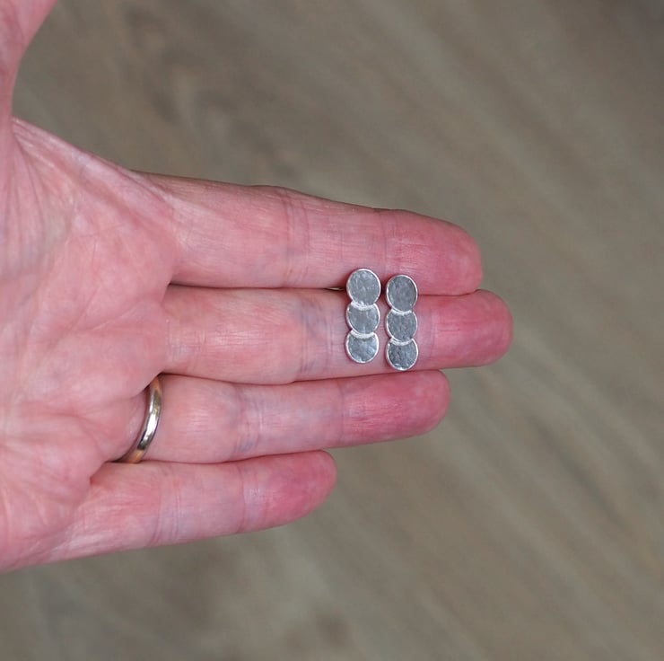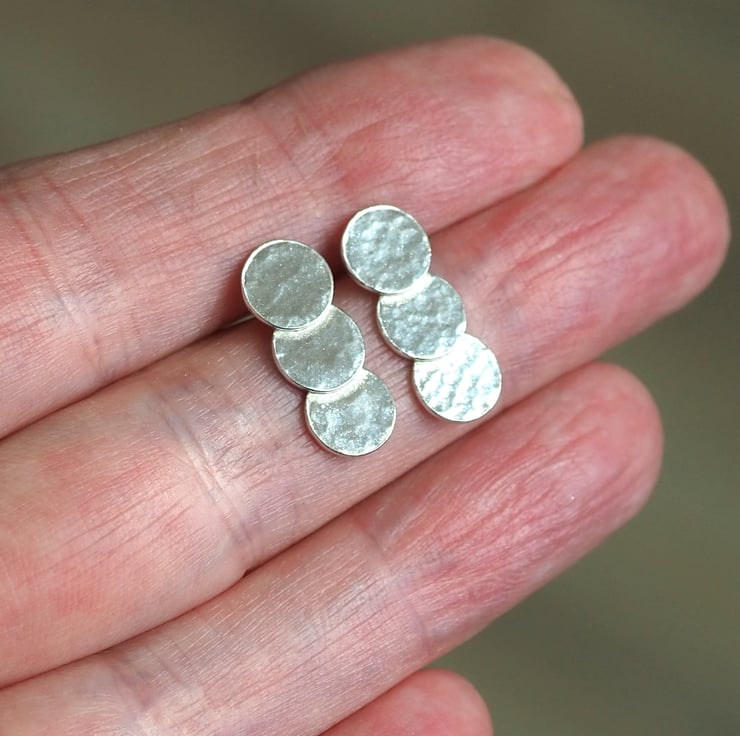 Silver triple disc stud earrings with hammered texture. Three hammered discs layered upon each other and fused together to create these stylish everyday stud earrings.