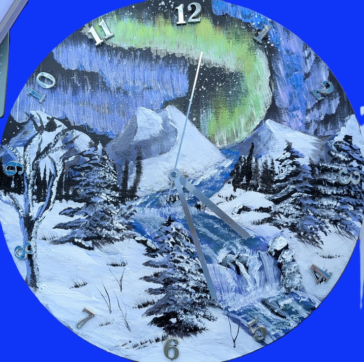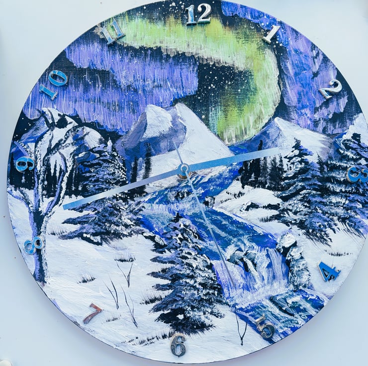 The vibrant and colourful Northern Lights have inspired this large clock. It is battery-operated, and the Battery is supplied. Each one is hand-painted with Acrylic Paints, to order, adding a personal touch to your decor. This isn't just a clock, it's a piece of your personality and style. We make this themed Clock to order, so there will be variations, of course, which makes each one unique. We will send photographs of the finished clock prior to posting.