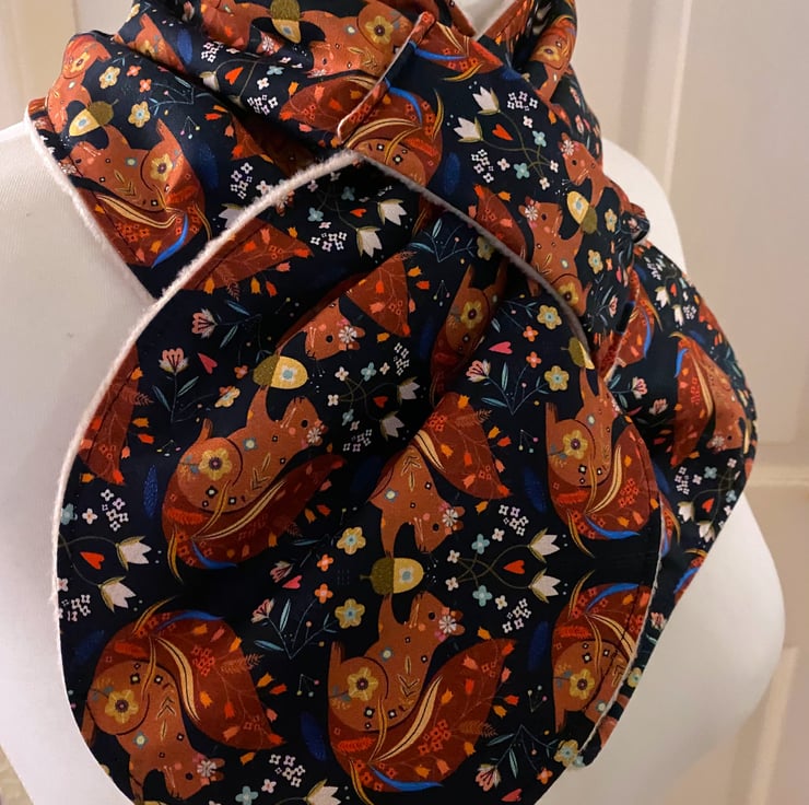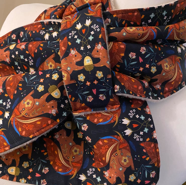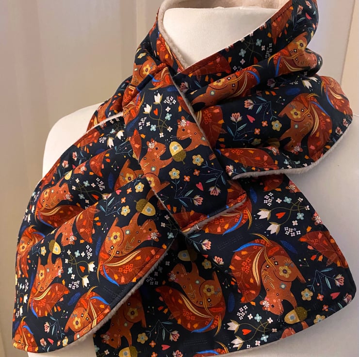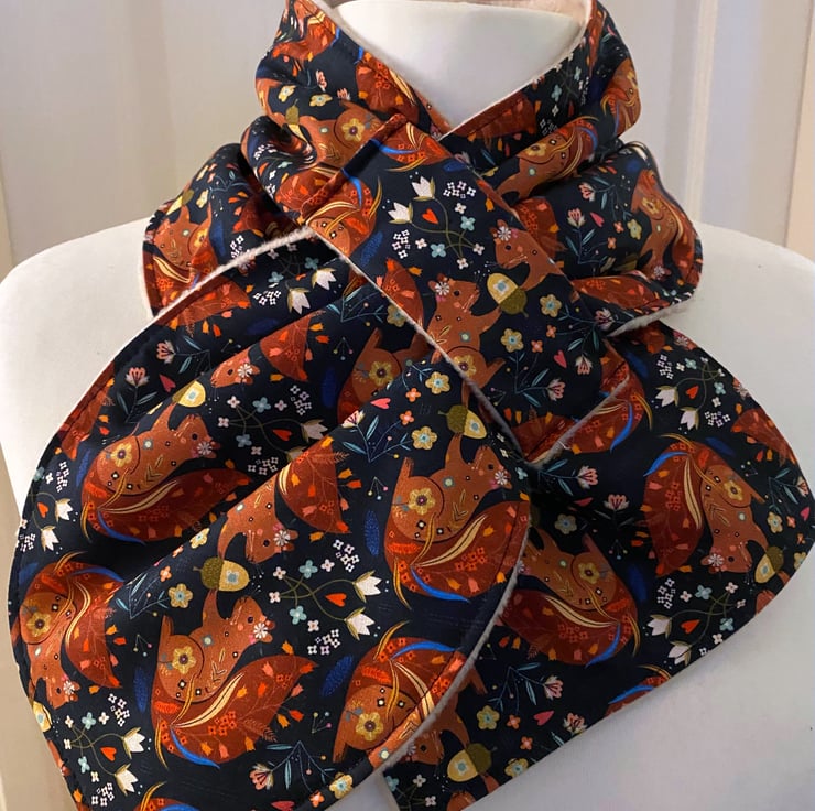 I’ve created this lovely fleece lined neck warmer scarf using a gorgeous 100% cotton print fabric and lined it with a soft warm fleece which compliments the colour of the outer.