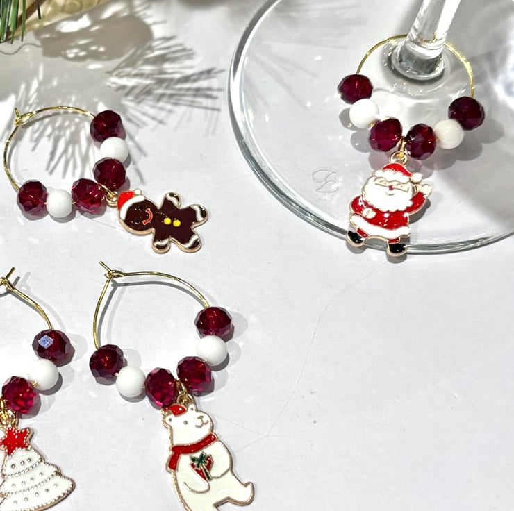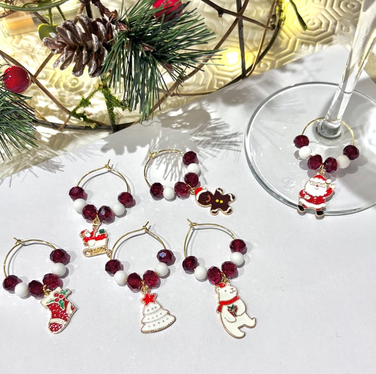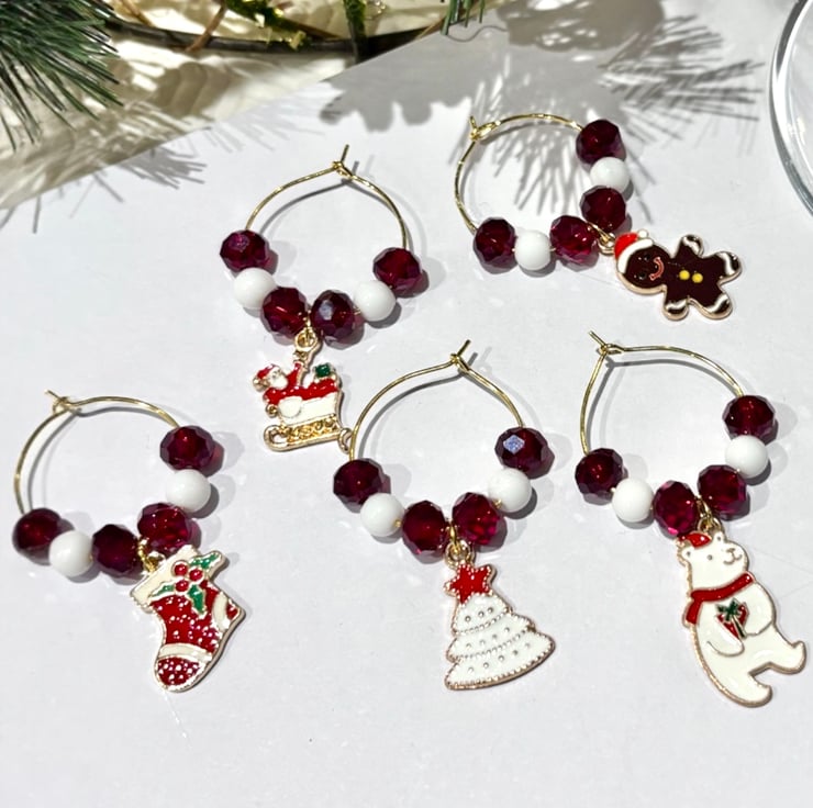 Set of 6 red and white wine Glass charms, made with pretty glass beads on gold plated wire hoops which fasten with a hook, each one has a different Christmas themed charm, perfect fun decorations for your table, so your guests will not get their glasses mixed up, the charms will be attached to a holder made specifically to hold wine glass charms.
