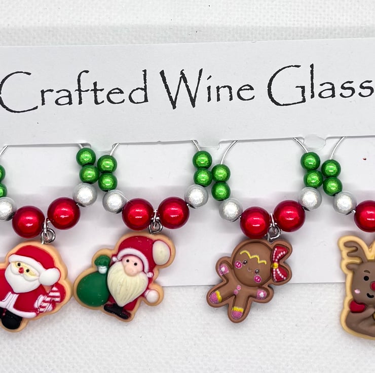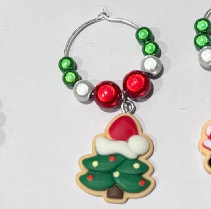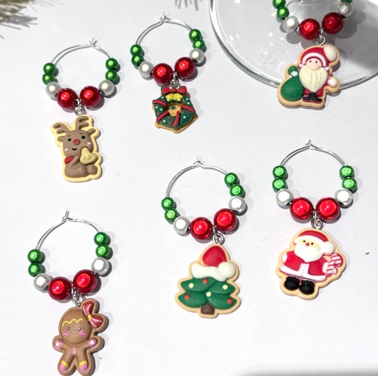 Set of 6 wine glass charms, pretty illusion beads in red, white and green on silver plated hoops, each one has a different contrasting Christmas themed charm, perfect fun decorations for your table setting, and ensures your guests don't get their glasses mixed up, they will be attached to a card specifically made to hold wine glass charms and covered with a cellophane self seal bag, postage is 48 hour tracked.