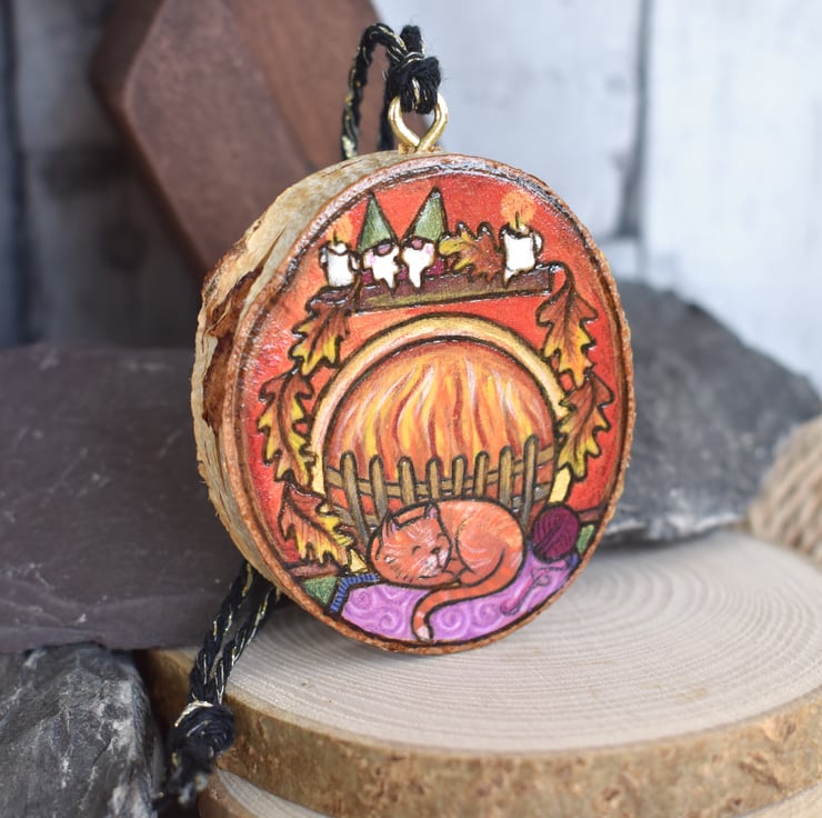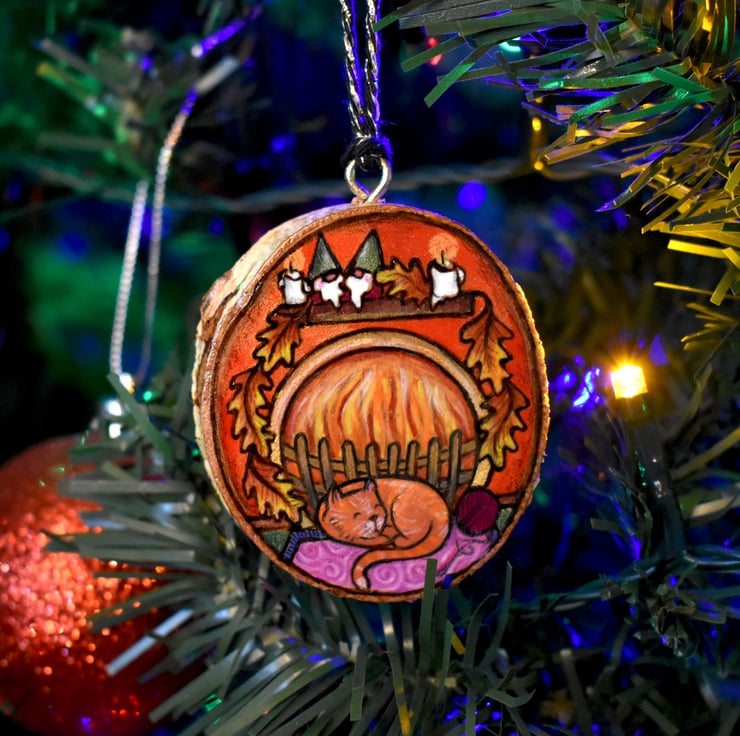A hand burned pyrography wood slice decoration, with a cosy festive scene featuring a sleeping kitty, and open fire, candles and a couple of gnomes!