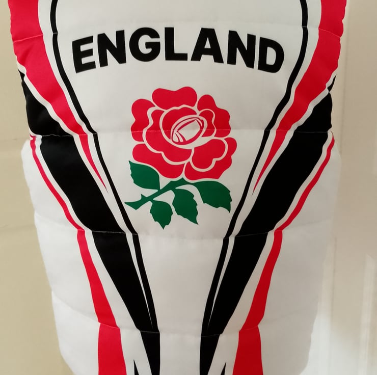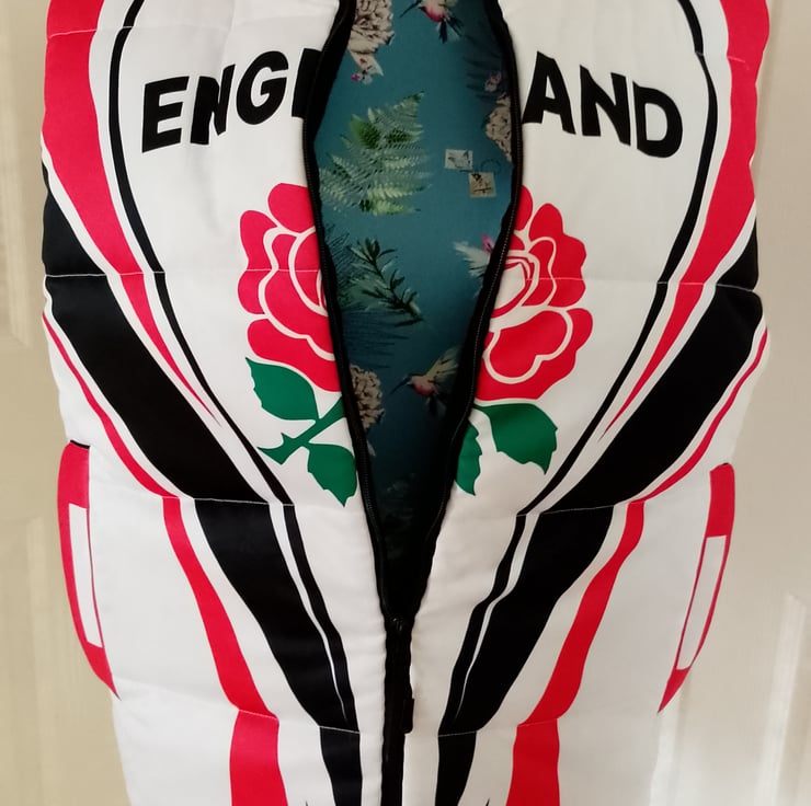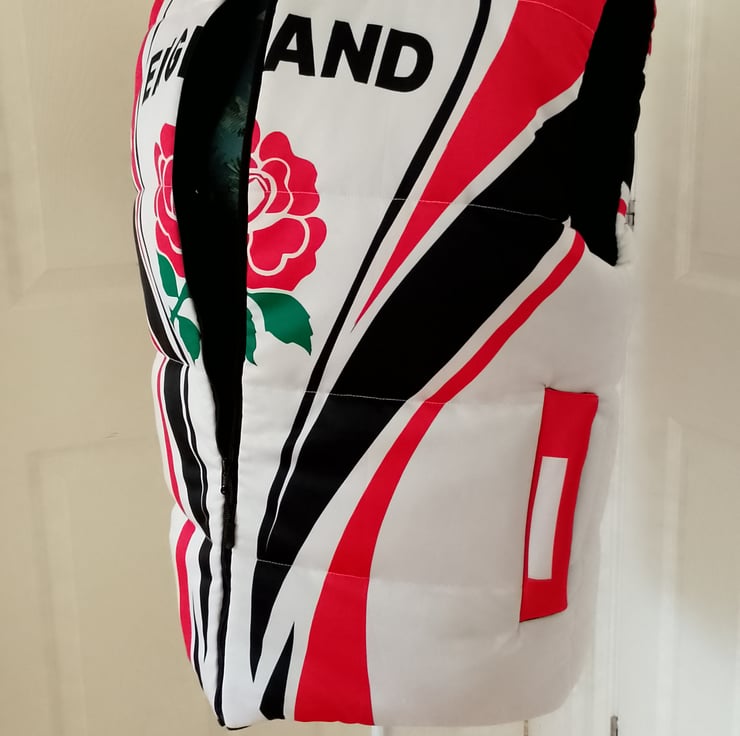 I have reworked a brand new England Rugby T shirt jersey which shows the English Rose on the front and back.