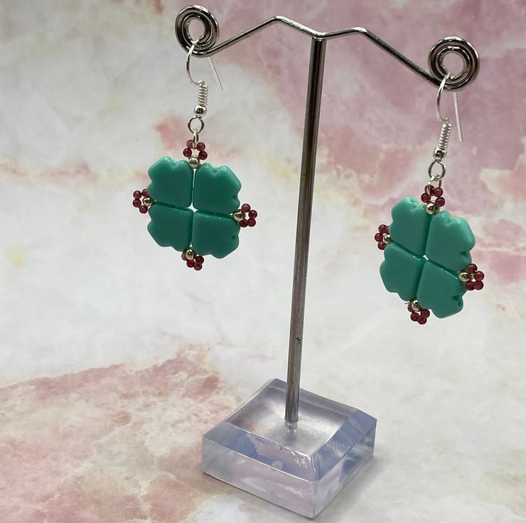 For these earrings, I used turquoise Czech dart beads and because of their shape I thought they'd look good woven together in a square. Each bead has two sets of holes so I was able to sew several times round them securely, adding some tiny 2mm garnet stones and a silver spacer bead in a loop at each corner.