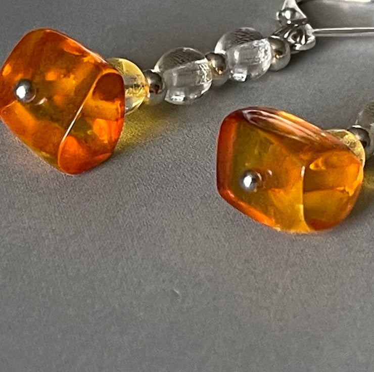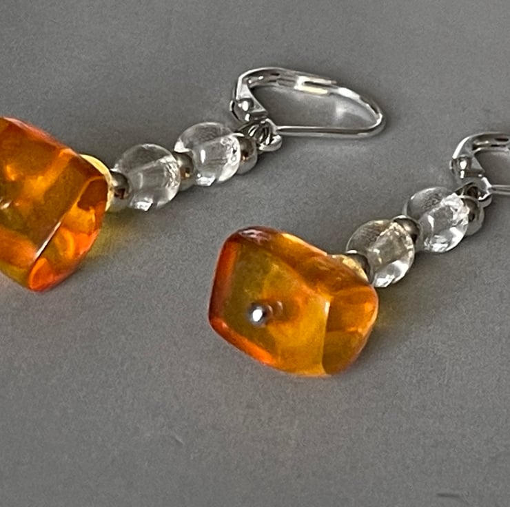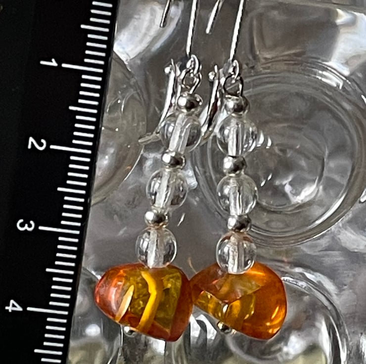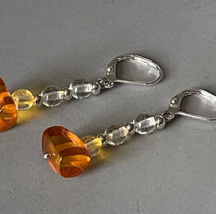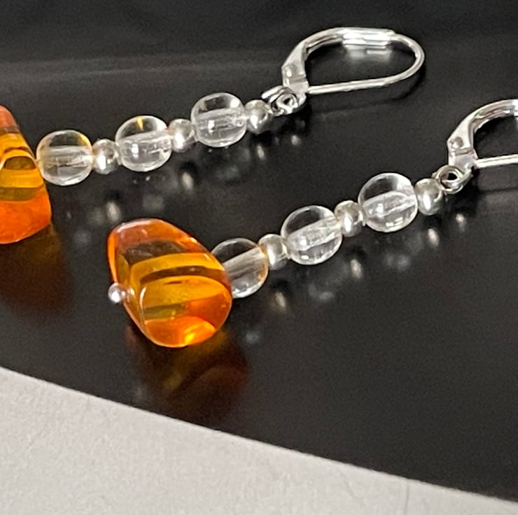 Gorgeous Artisan handmade Baltic honey colour amber and clear quartz/ rock crystal dangling earrings