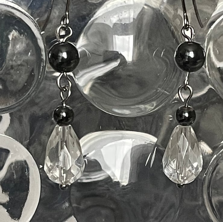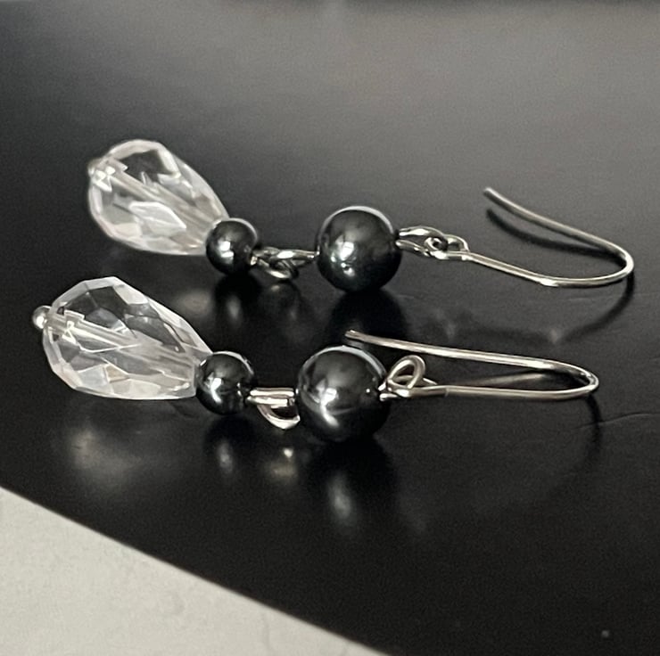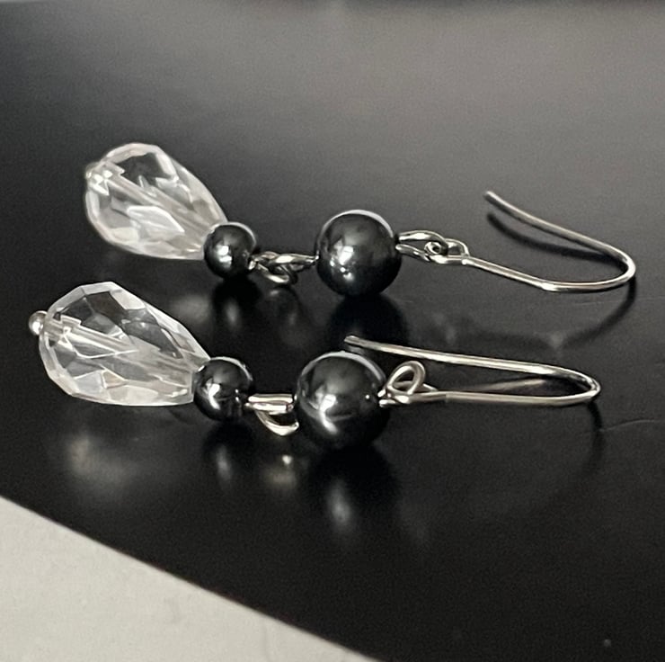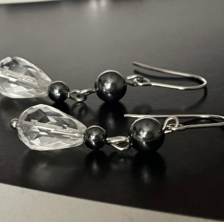 Gorgeous Artisan handmade Teardrop Quartz Rock crystal and hematite gemstones dangling earrings