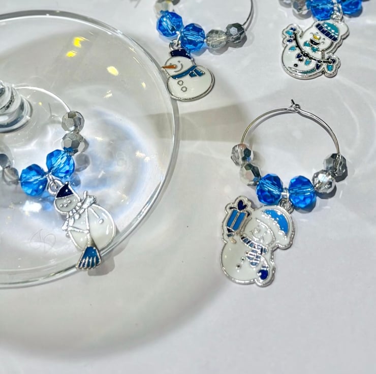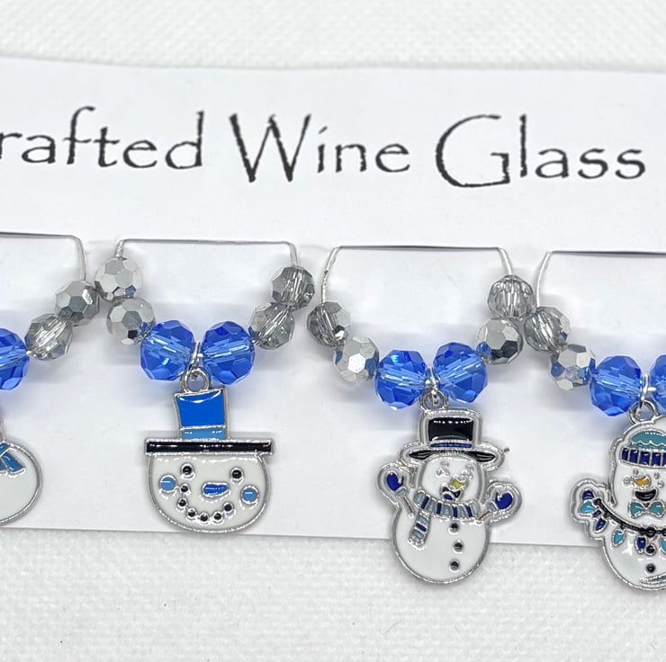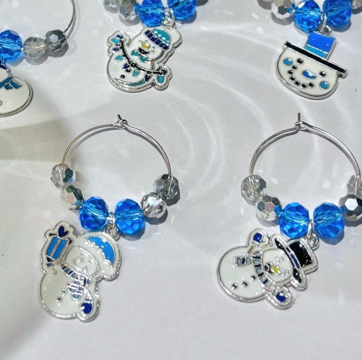 Set of 6 wine glass charms, blue and silver faceted glass crystal beads on silver plated hoops, each one has a snowman charm in a different pose, perfect fun decorations for your table setting, and ensures your guests don't get their glasses mixed up, they will be attached to a card specifically made to hold wine glass charms and covered with a cellophane protective cover.