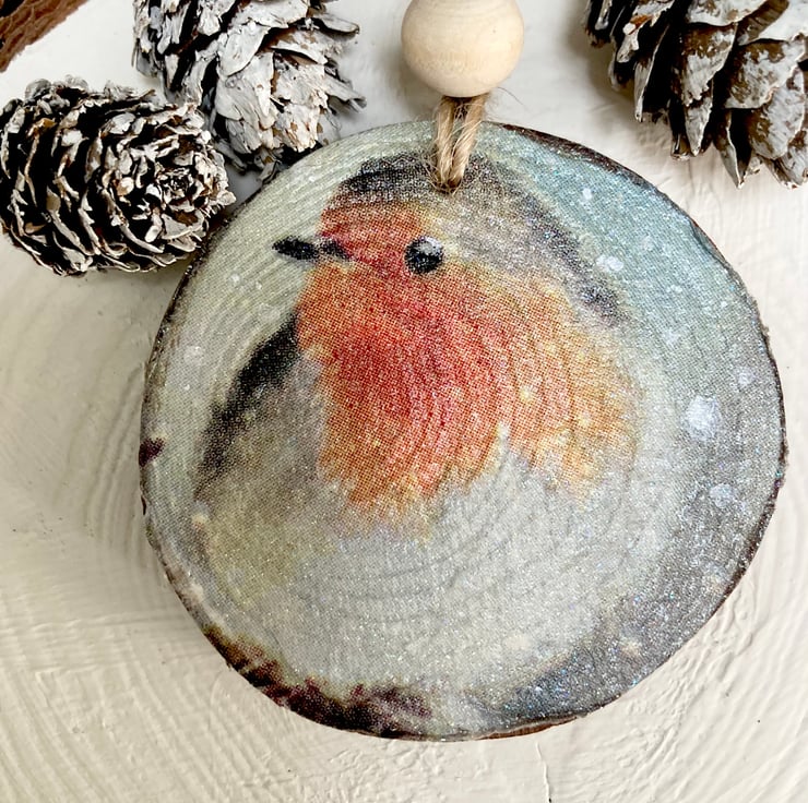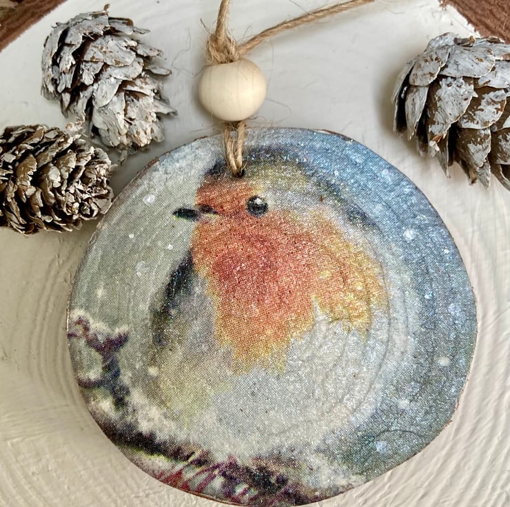 Handmade natural wood slice decoupaged and hand painted with a sweet little winter Robin, I have also added sublte water based varnish and a very slight dusting of glitter