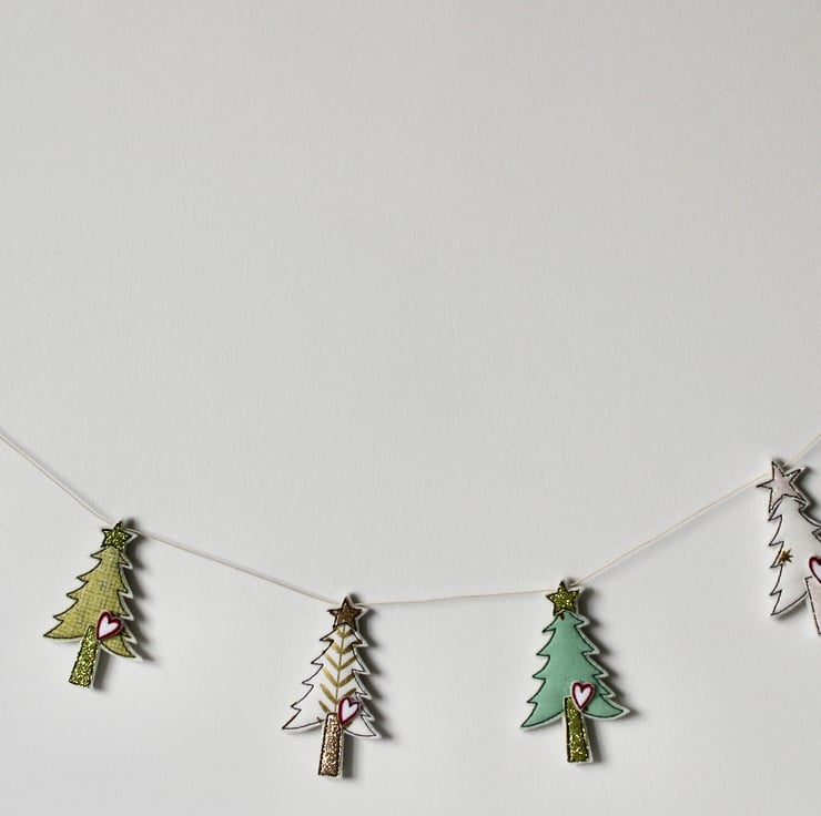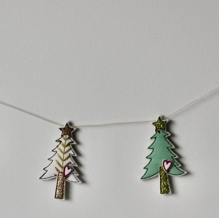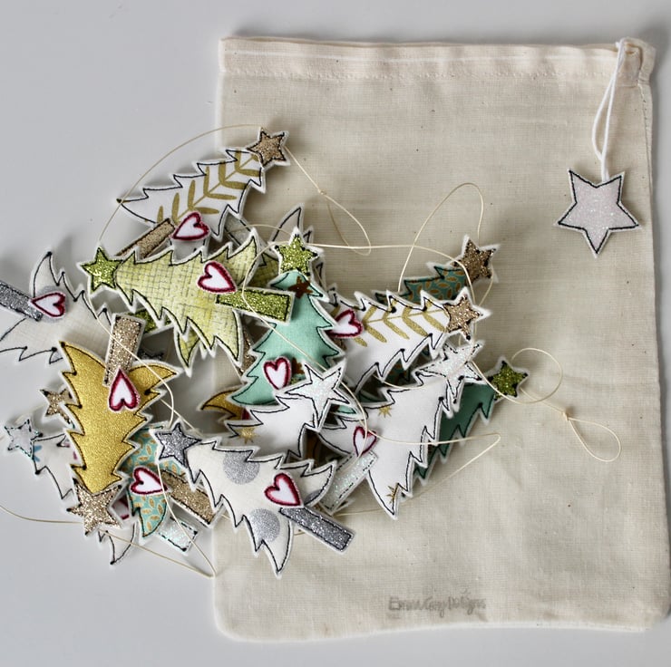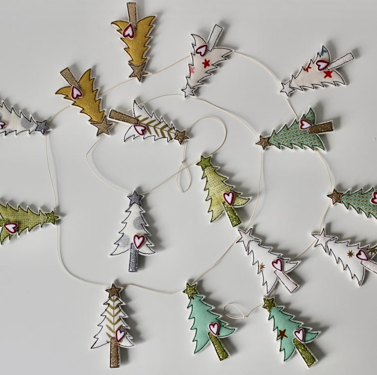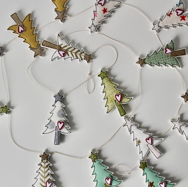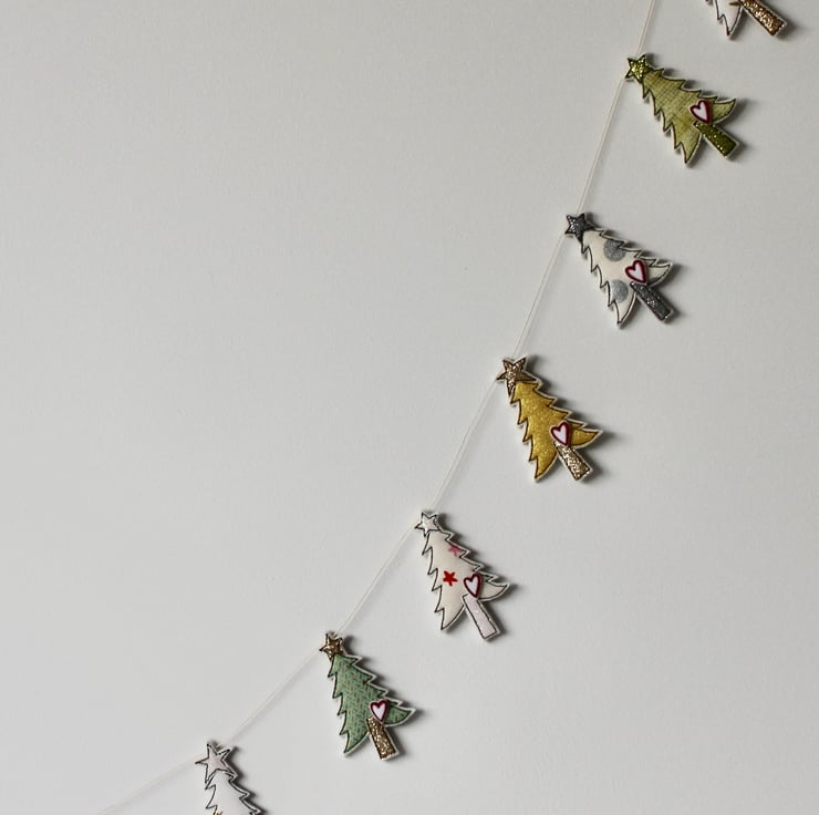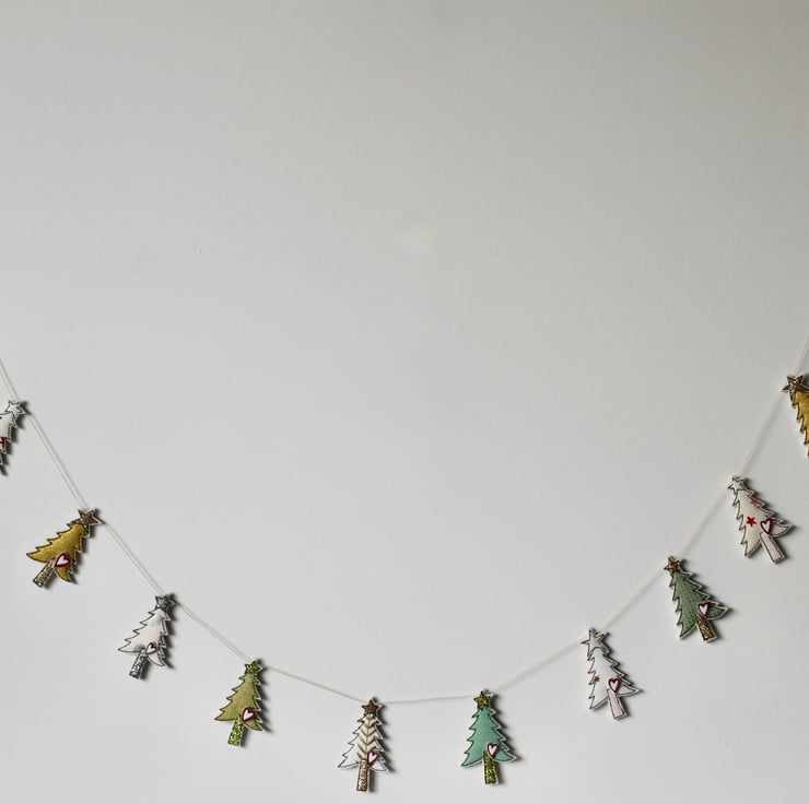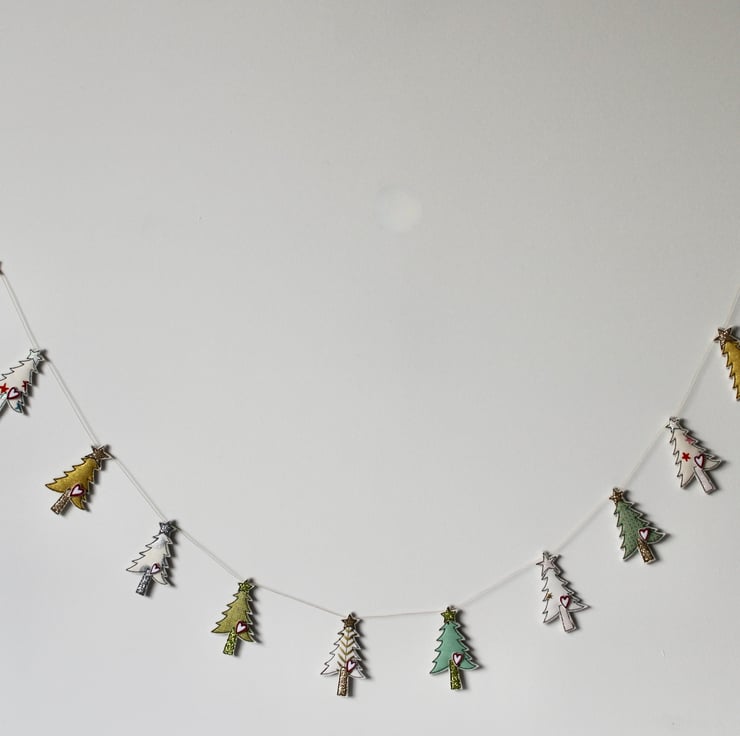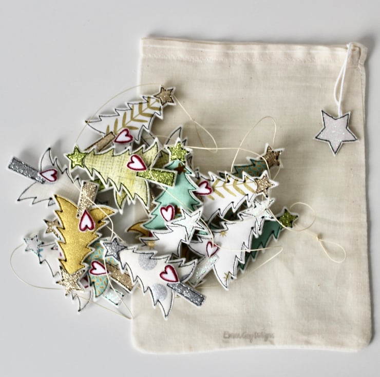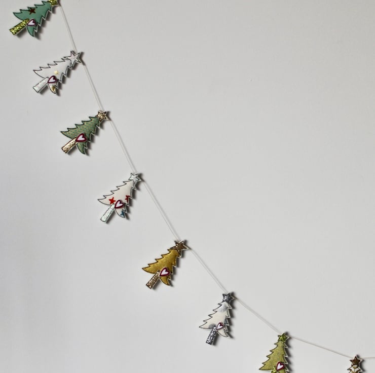 Each of the sixteen trees suspended along this garland, are sewn using a combination of 100% wool felt, cotton cloth, glitter cloth and free hand machine embroidery; multiple layers of cloth are sewn together and cut out by hand using very sharp scissors.