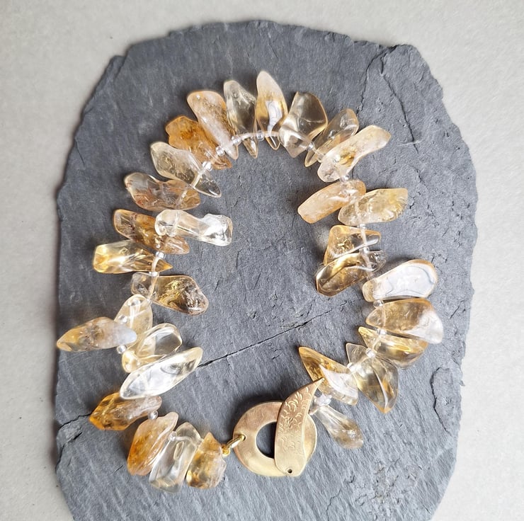 The bracelet is crafted from hand-strung, polished yellow quartz chips. Each warm, translucent bead captures and reflects the light like a drop of liquid sunshine, creating a versatile and cheerful accessory that brings a touch of organic brightness to any wrist.