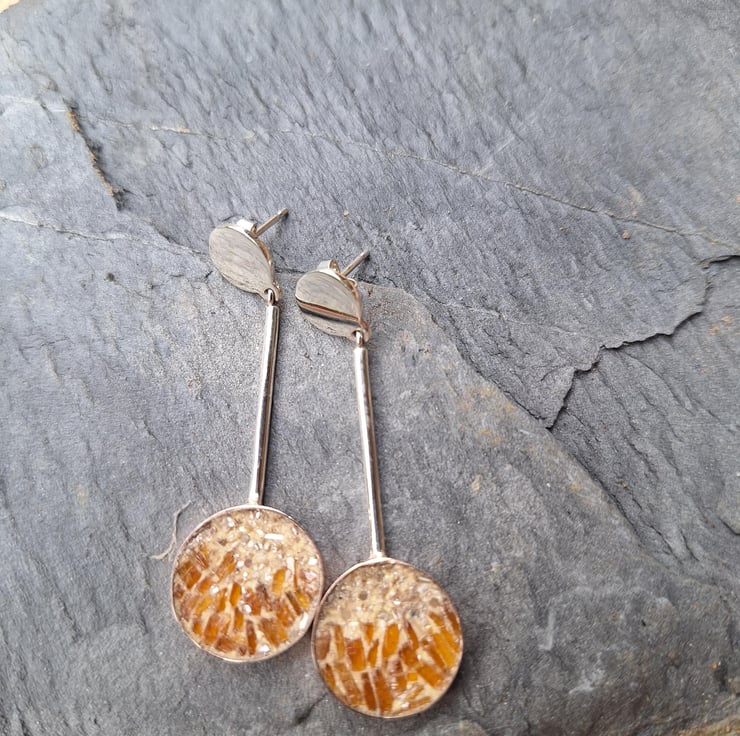 Adorn your ears with these stunning handcrafted silver earrings, where a sleek bronze ball is delicately suspended from a silver thread, creating a modern yet timeless silhouette. The eye-catching centerpiece is artfully decorated with a mosaic of natural orange kyanite and crushed diamonds that add a touch of brilliance.