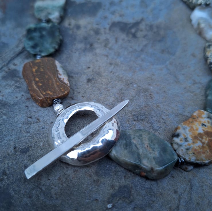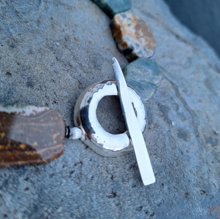 This lightweight yet statement-making choker is adorned with a chunky handmade sterling silver (925) clasp, adding a bold yet balanced contrast to the organic beauty of the stones. The secure clasp ensures a comfortable fit while making a striking visual impact.