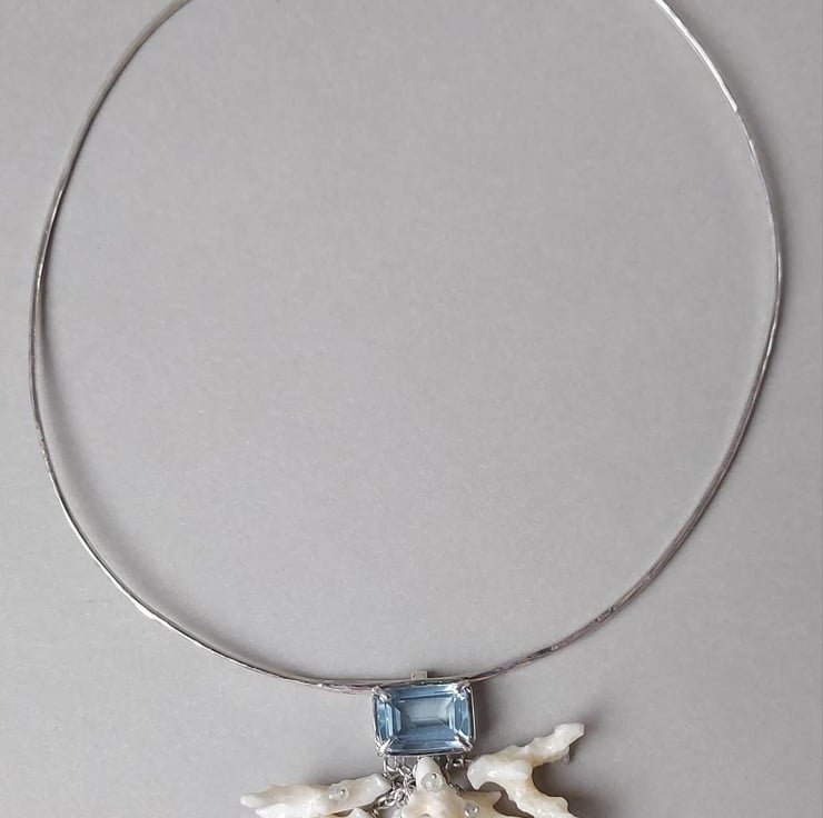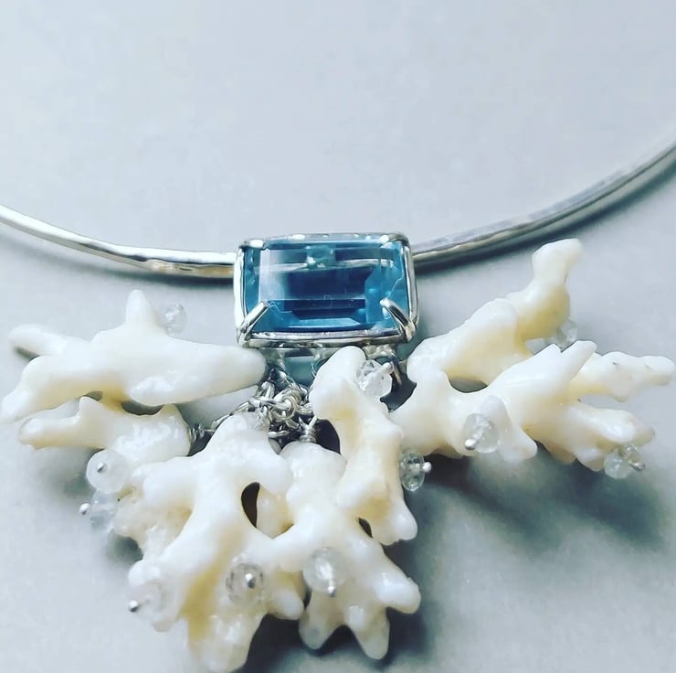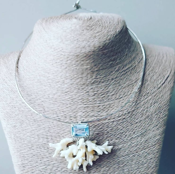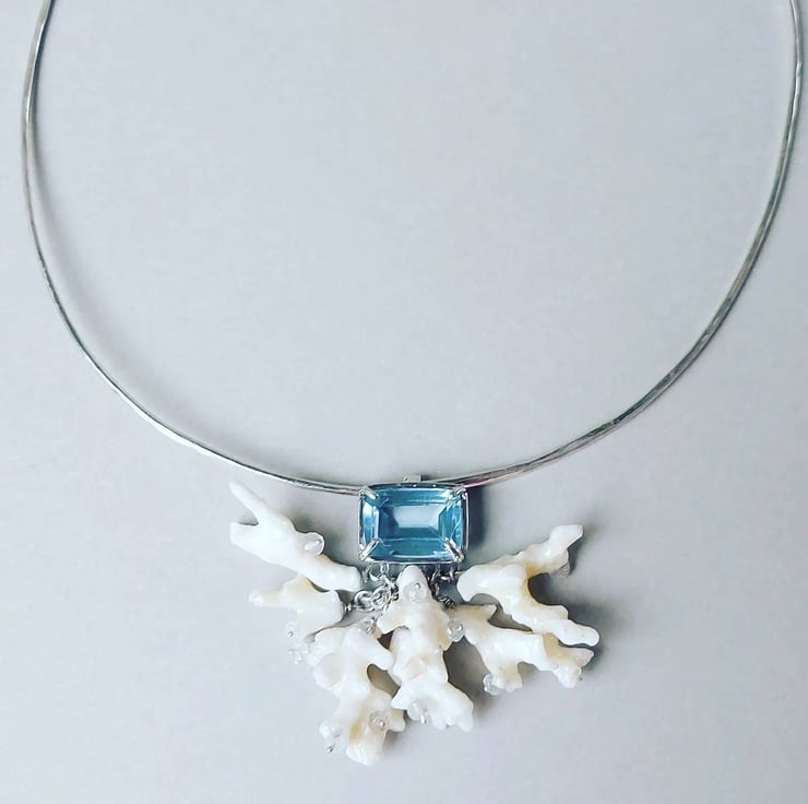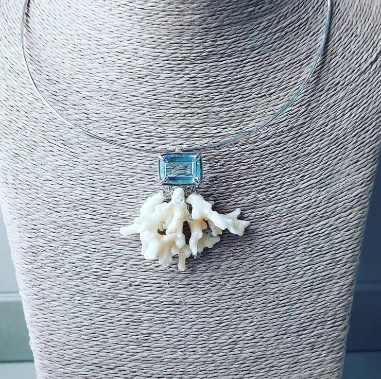 A tribute to theIndian Ocean, this stunning necklace carries the essence of the ocean. Each unique coral piece was hand-selected from the sun-drenched beaches of Mauritius, creating a one-of-a-kind foundation. It's adorned with genuine aquamarine beads and crowned with a striking imitation aquamarine gemstone, reflecting the deep, crystalline waters. While it makes a perfect companion to my coral earrings, its bold and unusual presence speaks volumes all on its own.