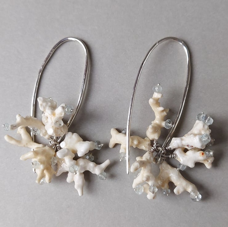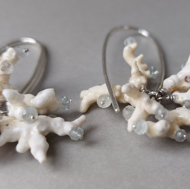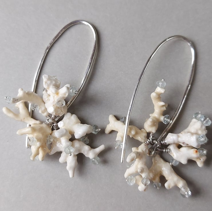 Natural corals earrings with Aquamarines. Contemporary jewellery. 925 Silver