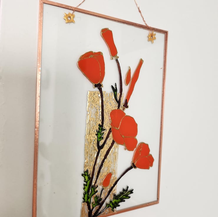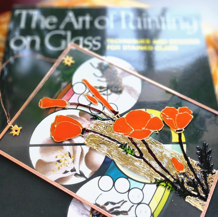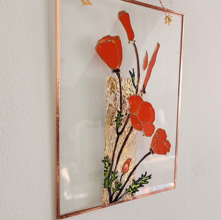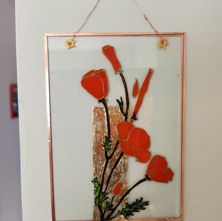 This stained glass is a botanical decoration for a window or wall. I used water resistant glass paint and gold leaf to adding a little extra spark