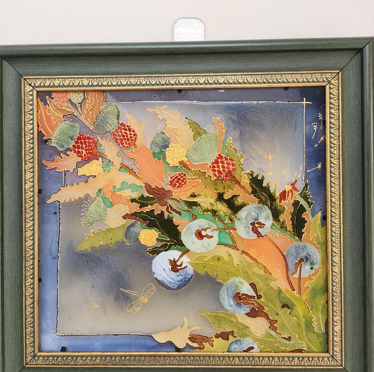 CARE: To maintain the beauty of this glass painting, gently clean with a soft, damp cloth. Avoid using harsh chemicals or submerging the artwork in water, as this could damage the painted surface.