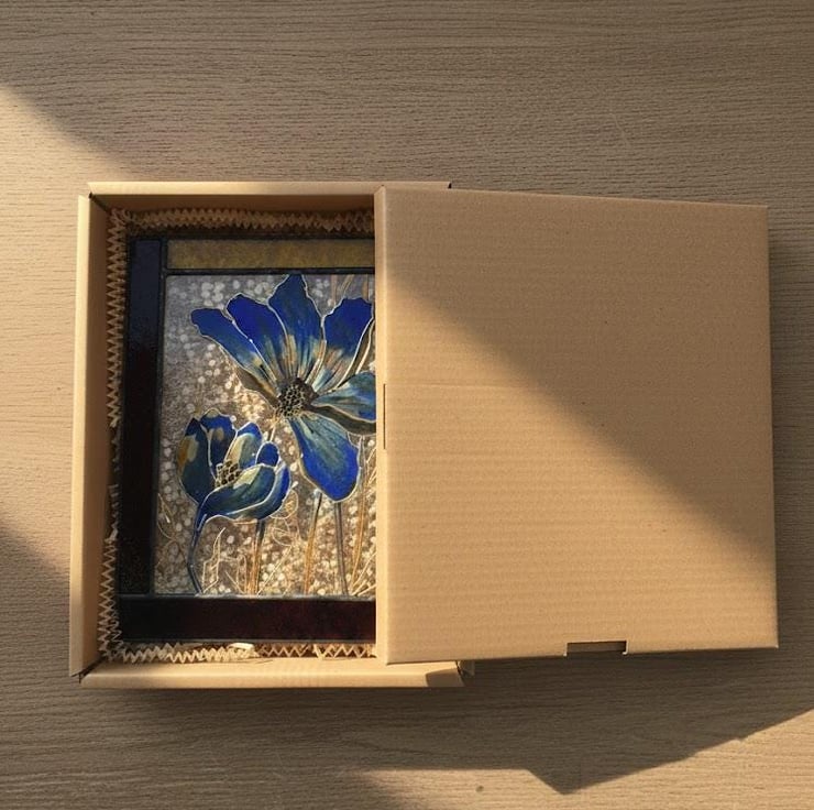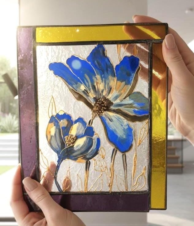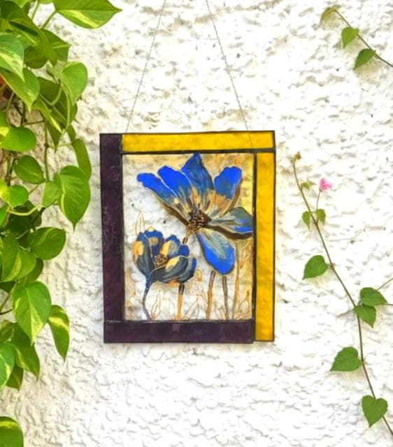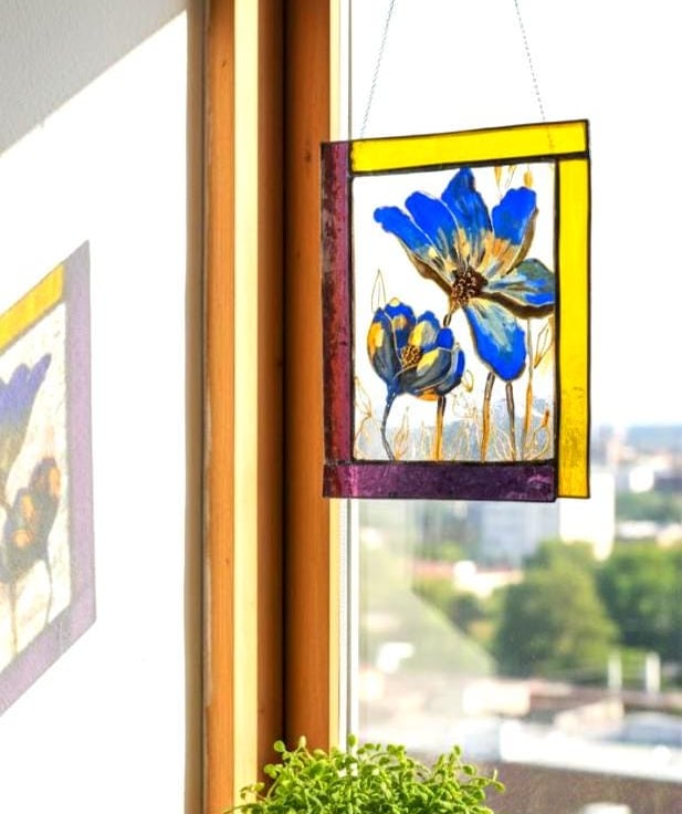 The blue and gold flowers are lovingly hand painted with special acrylics that beautifully transmit sunlight These special paints are sun and water resistant, so your artwork will keep its brilliant look for years to come.