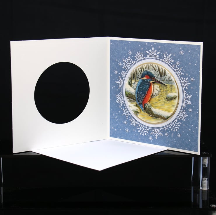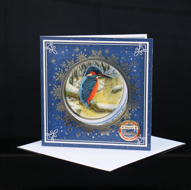I completed the gold foiled, 300gsm, decoupaged topper of a kingfisher perched on a snow covered branch in Winter and layered it onto a 140gsm insert.
