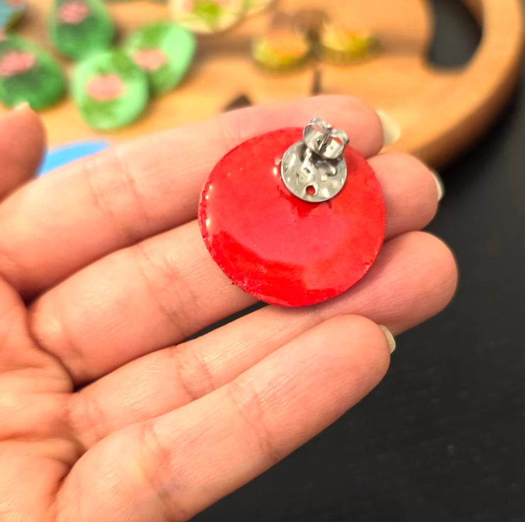 These bold earrings are made from air-dry clay, hand-painted with acrylics, and finished with a protective resin coating that enhances their shine and durability.